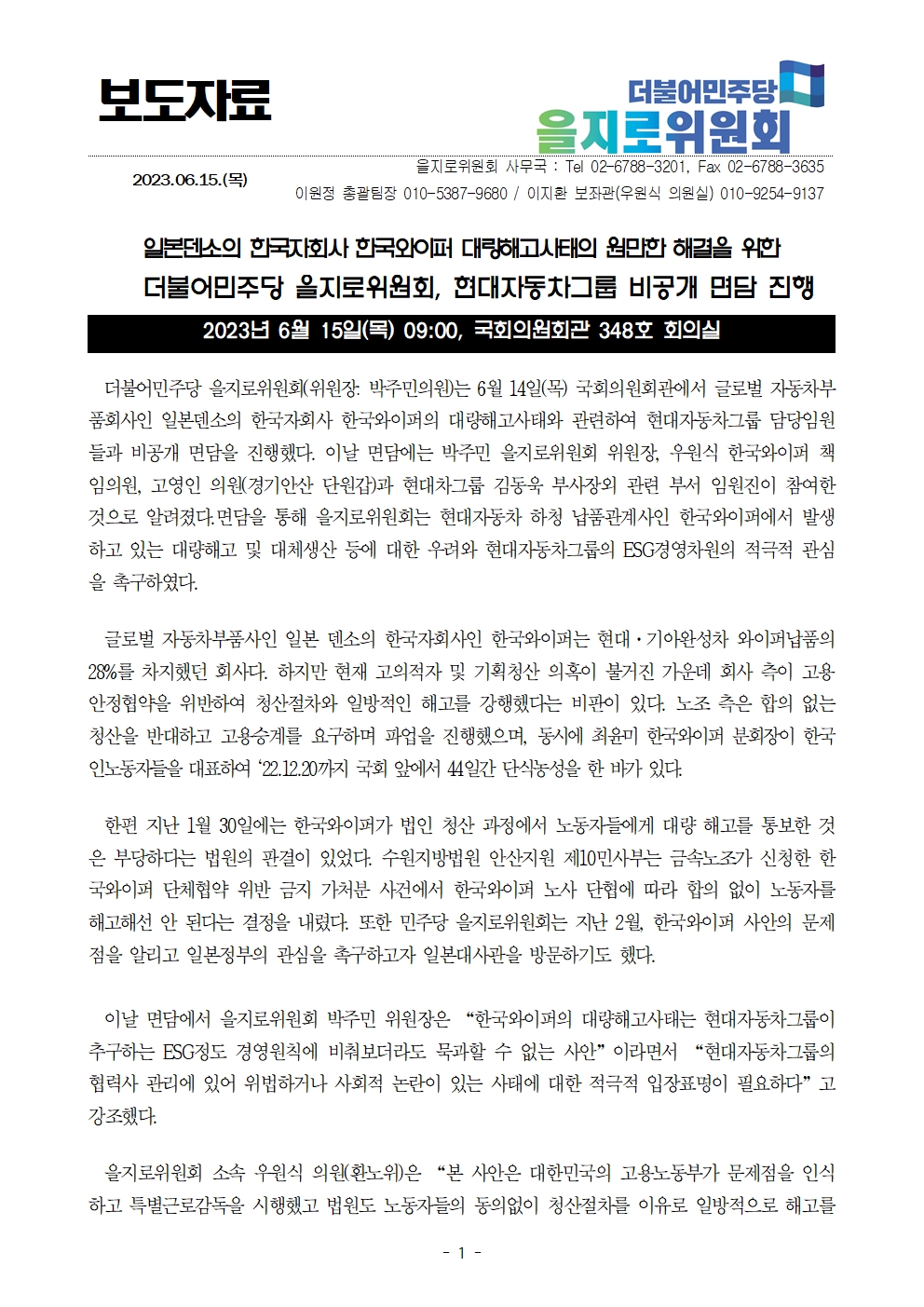 230615_(보도자료)_을지로위원회_한국와이퍼_관련_현대자동차그룹_비공개_면담_진행_fn3085.hwp