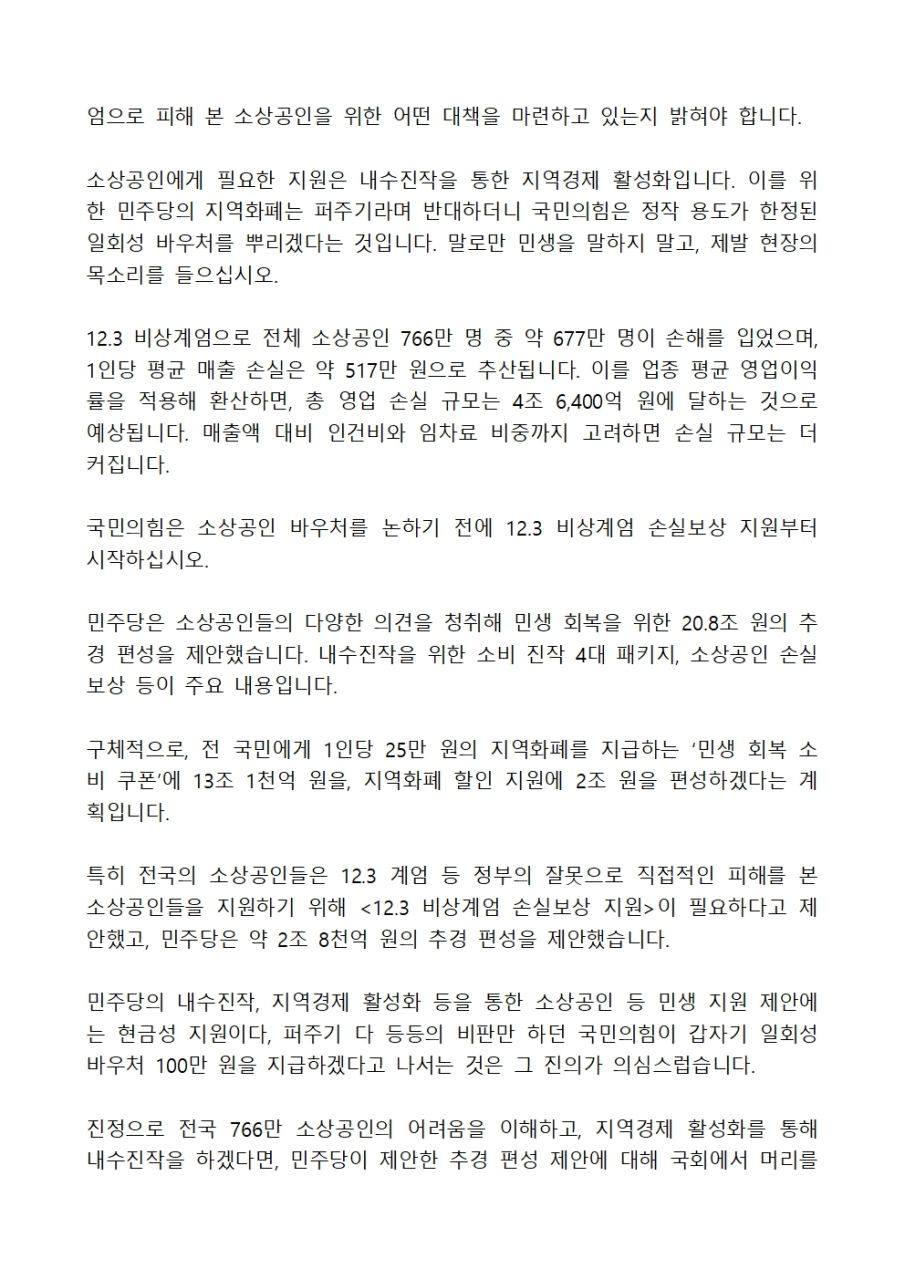 더불어민주당 전국소상공인위원회, 국민의힘은 말로만 민생을 말하지 말고, 제발 현장의 목소리를 들으십시오!