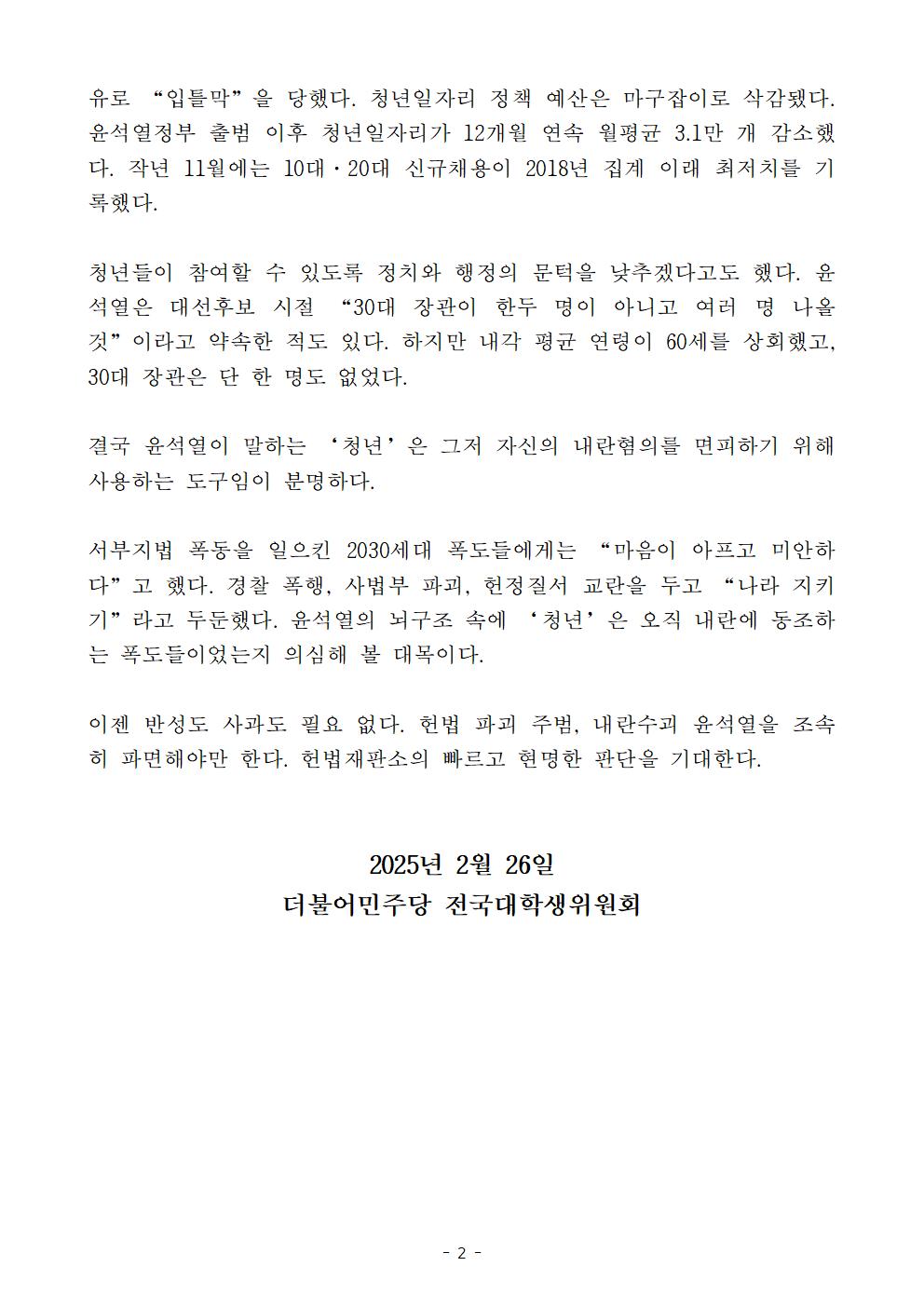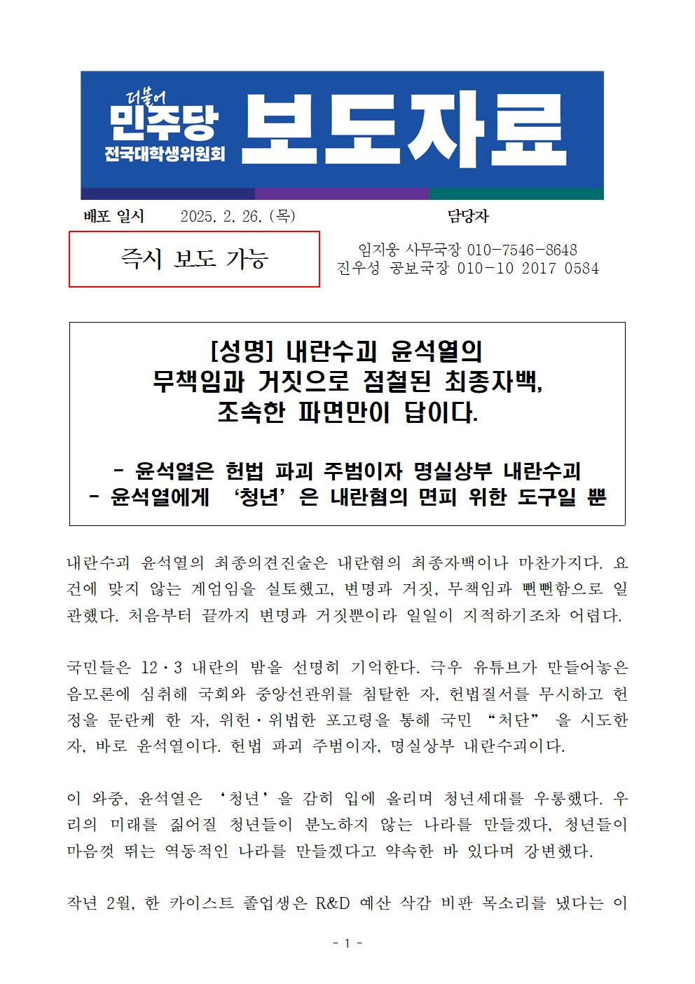 더불어민주당 전국대학생위원회, 내란수괴 윤석열의 무책임과 거짓으로 점철된 최종자백, 조속한 파면만이 답이다.