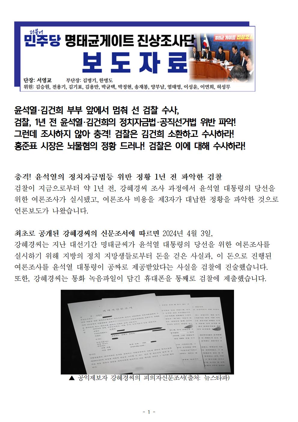 더불어민주당 명태균게이트 진상조사단, 윤석열·김건희 부부 앞에서 멈춰 선 검찰 수사, 검찰, 1년 전 윤석열·김건희의 정치자금법·공직선거법 위반 파악! 그런데 조사하지 않아 충격! 검찰은 김건희 소환하고 수사하라! 홍준표 시장은 뇌물혐의 정황 드러나! 검찰은 이에 대해 수사하라!