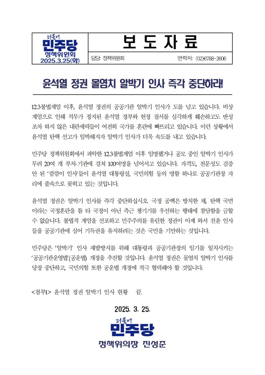 더불어민주당 정책위원회, 윤석열 정권 몰염치 알박기 인사 즉각 중단하라!