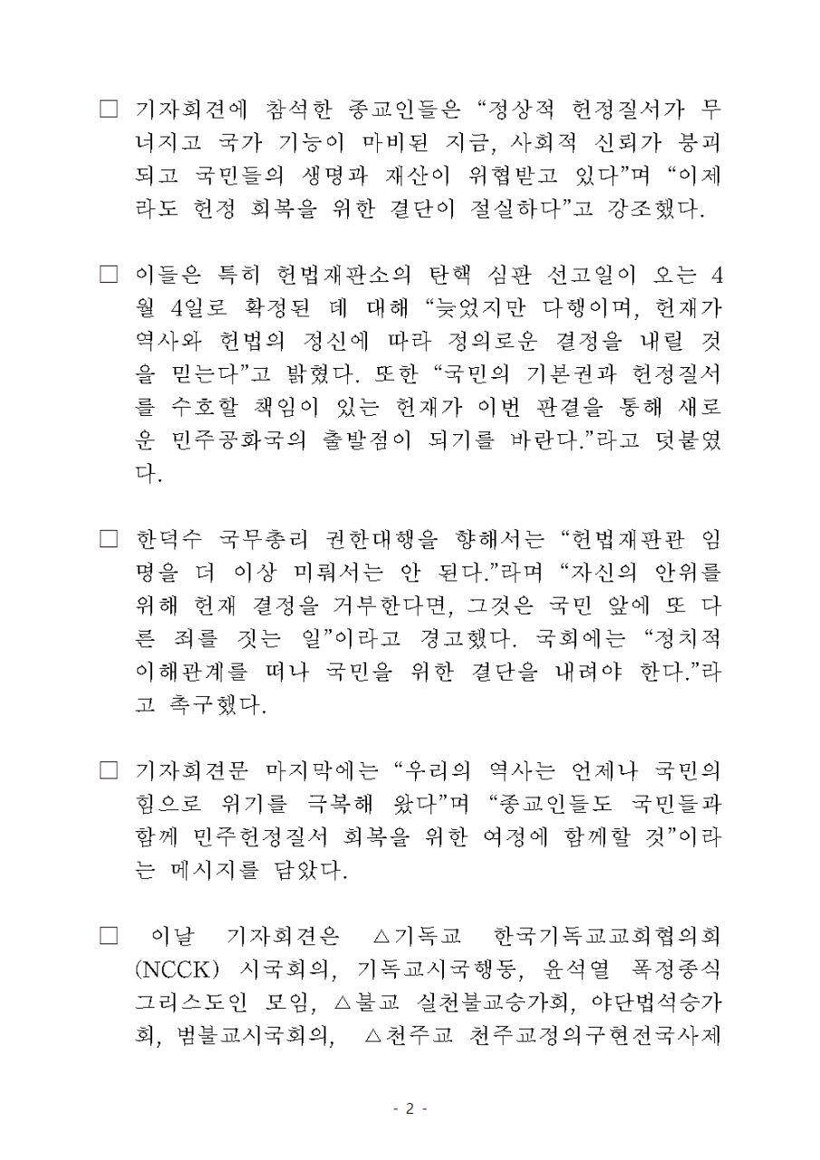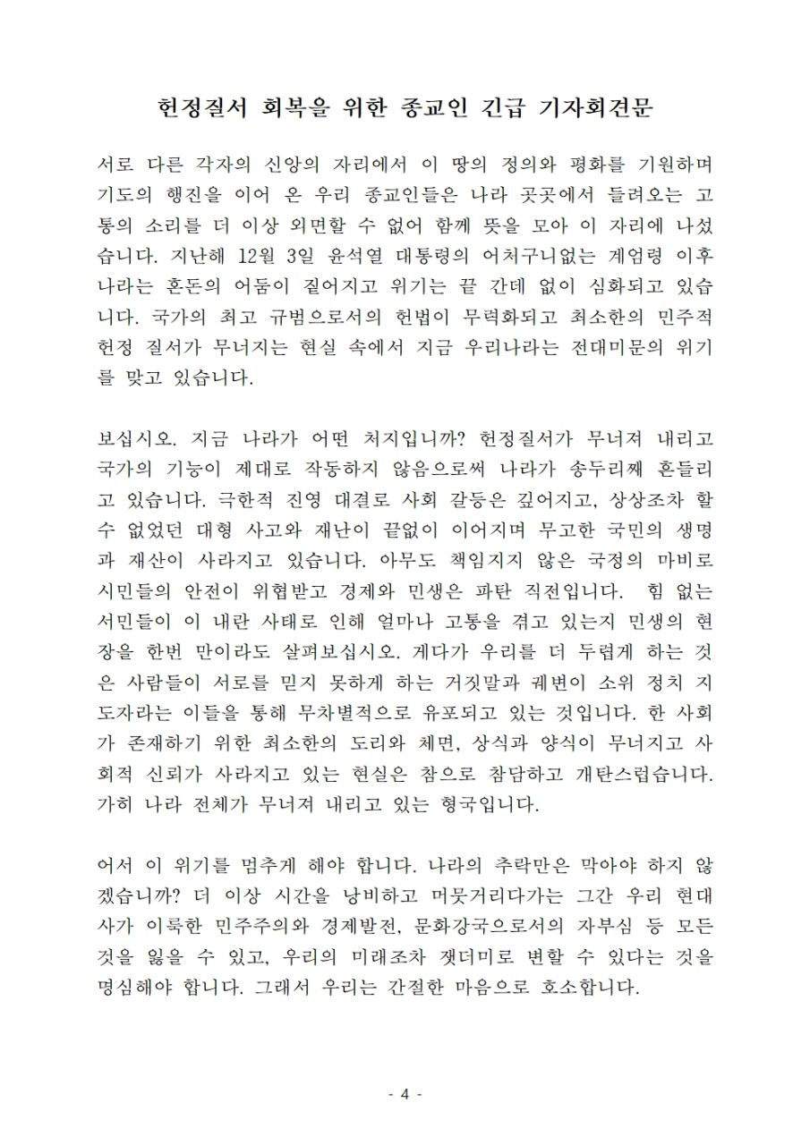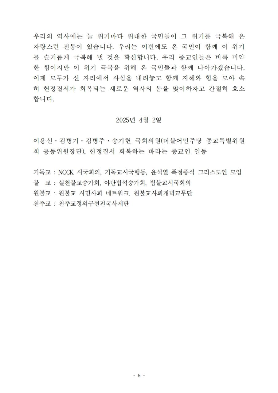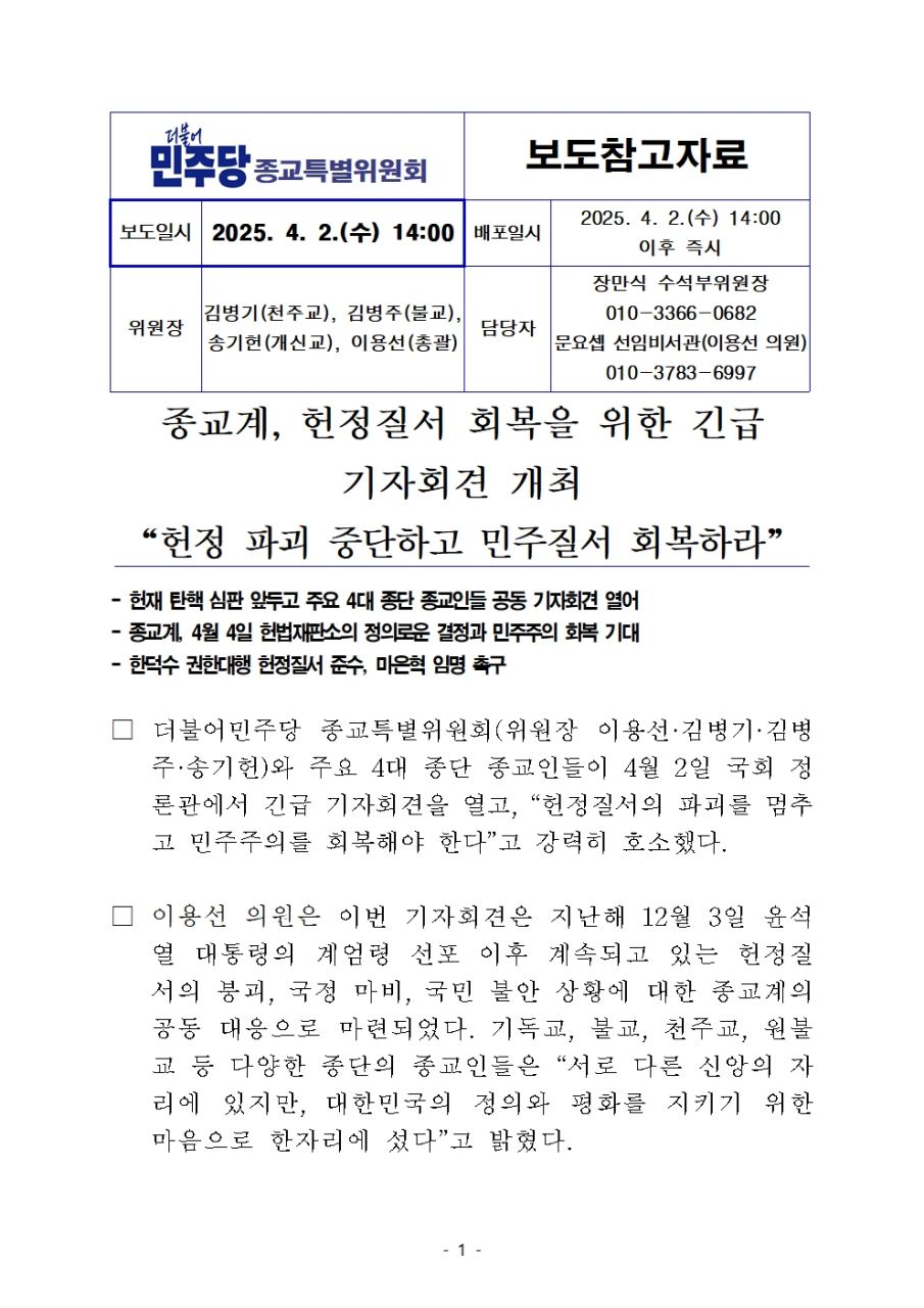 더불어민주당 종교특별위원회, 헌정질서 회복을 위한 긴급 기자회견 개최 “헌정 파괴 중단하고 민주질서 회복하라”