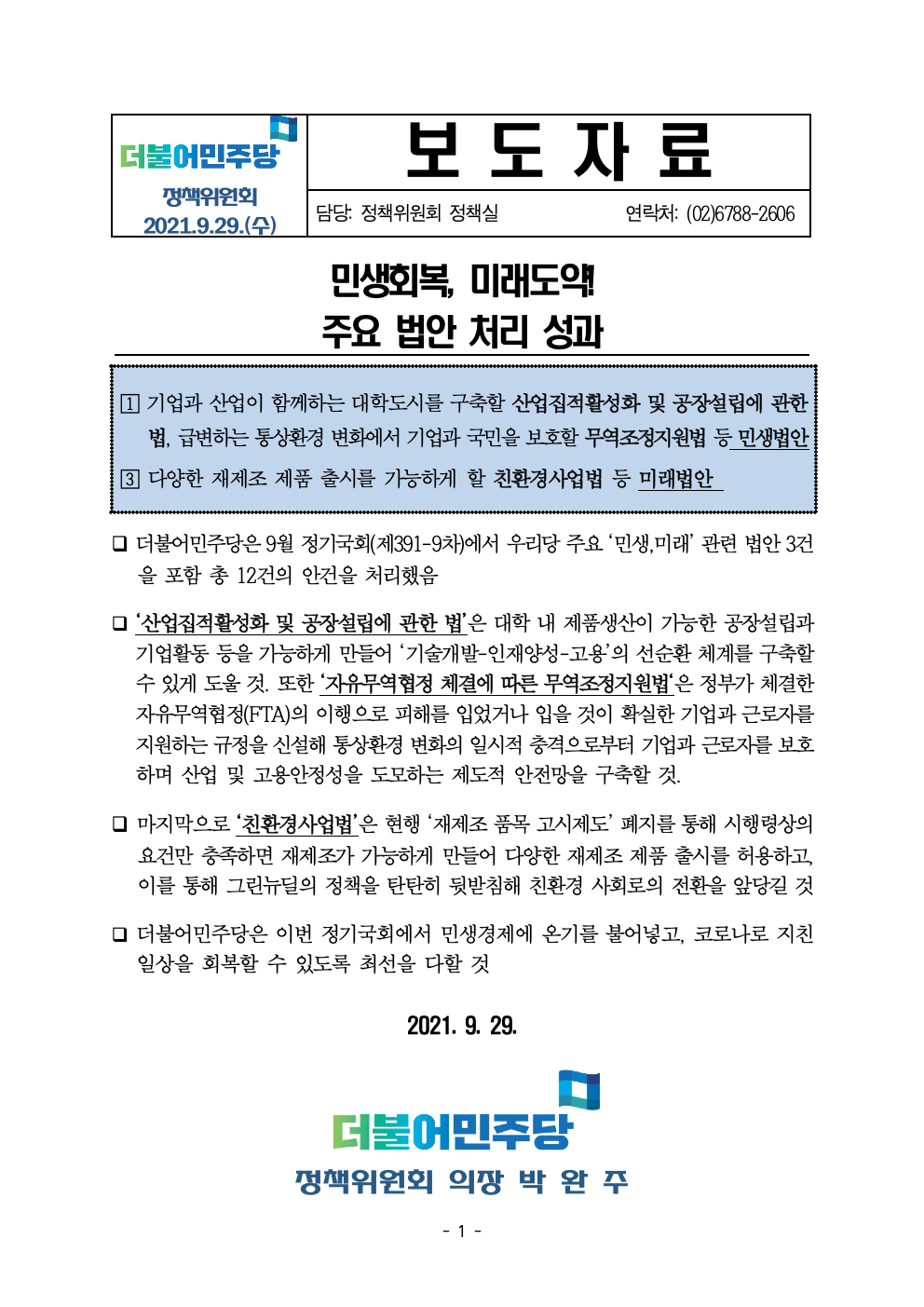 [보도자료]더불어민주당 정책위원회 9월 입법성과 보도자료