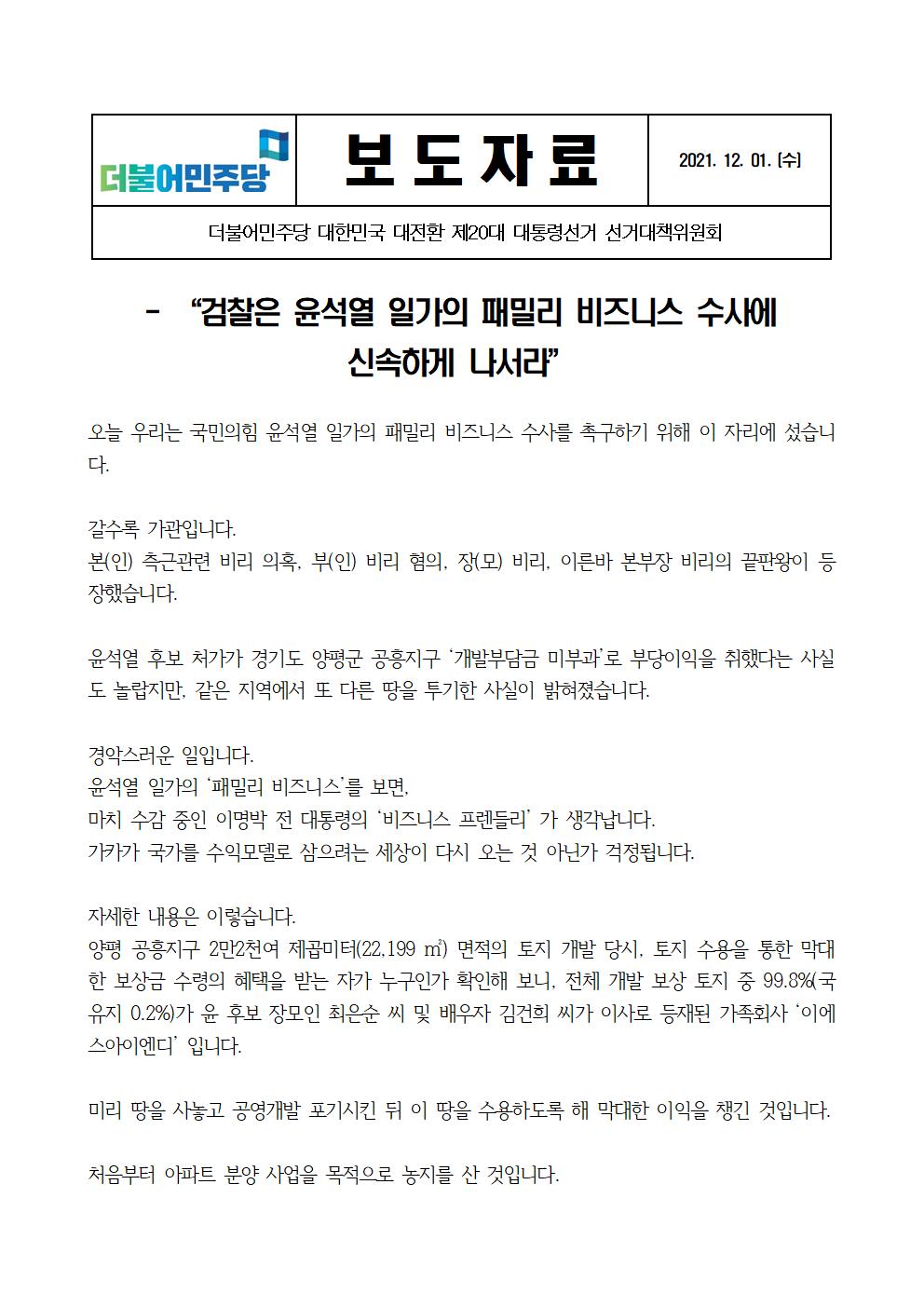 [보도자료] 더불어민주당 선대위 현안대응 TF, 윤석열 후보 장모는 농업인인가 부동산 투기꾼인가