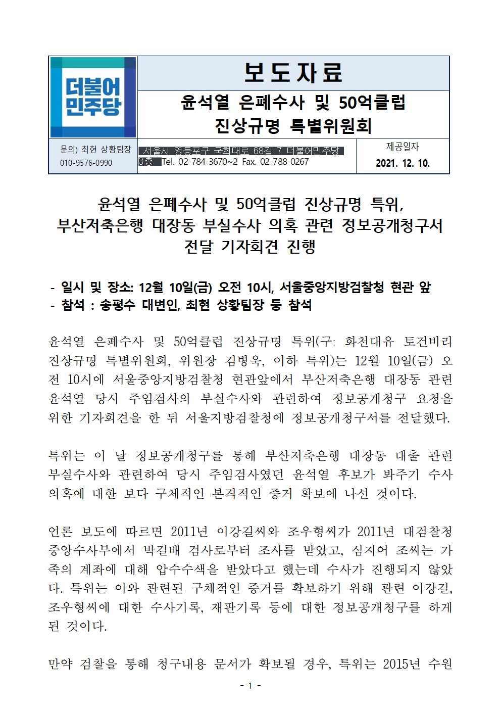 [보도자료] 더불어민주당 윤석열 은폐수사 및 50억클럽 진상규명특위, 부산저축은행 대장동 부실수사 의혹 관련 정보공개청구서 전달 기자회견