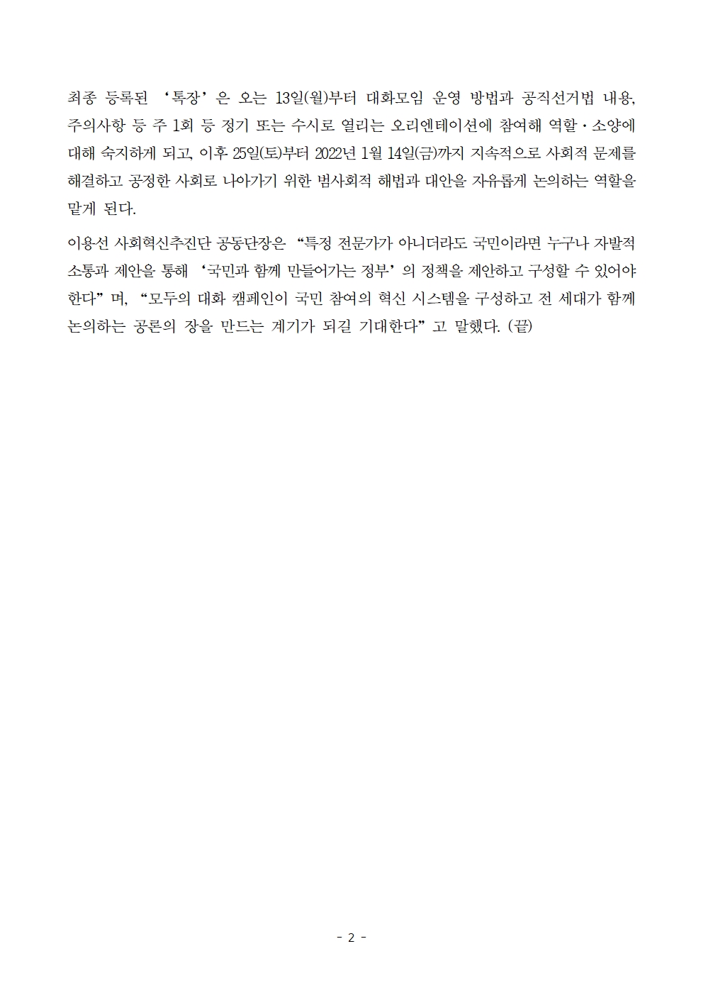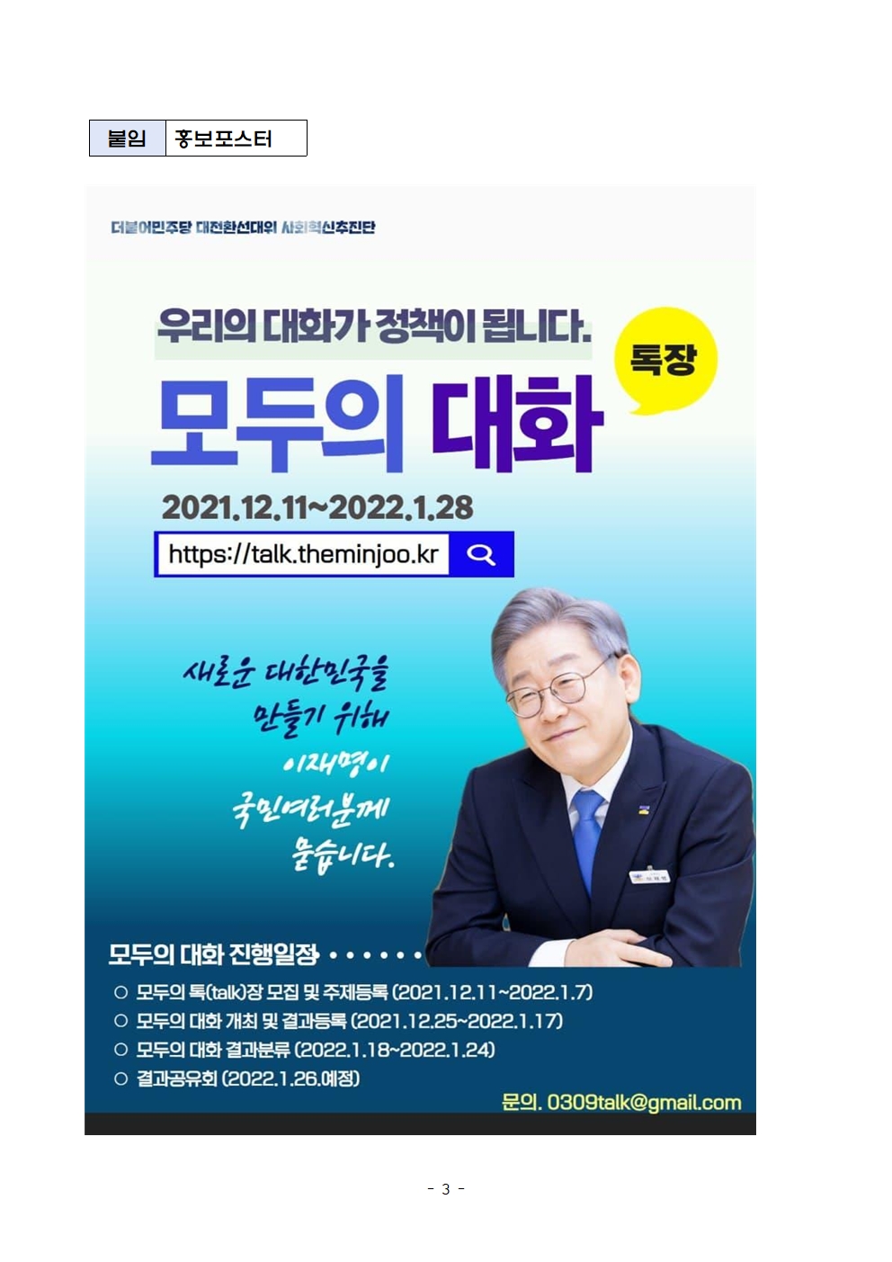 [보도자료] 더불어민주당 선대위 사회혁신추진단, '모두의 대화' 캠페인 시작, '모두의 톡(Talk)장’ 모집 개시