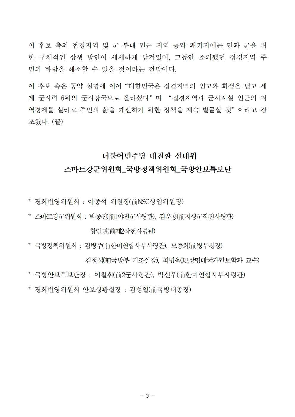 [보도자료] 더불어민주당 선대위 평화번영위원회, 접경지역 및 군부대 주변 주민 보상 공약 발표