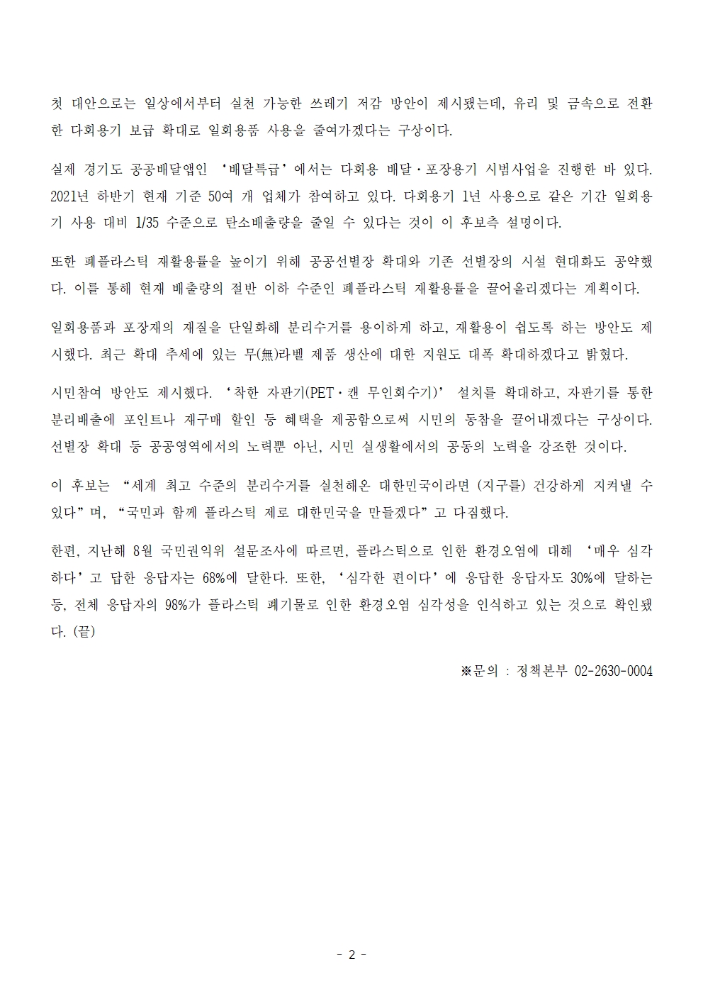 [보도자료] 더불어민주당 선대위 정책본부, '이재명의 합니다. 소확행 공약 시리즈 29' 플라스틱 제로 사회 공약