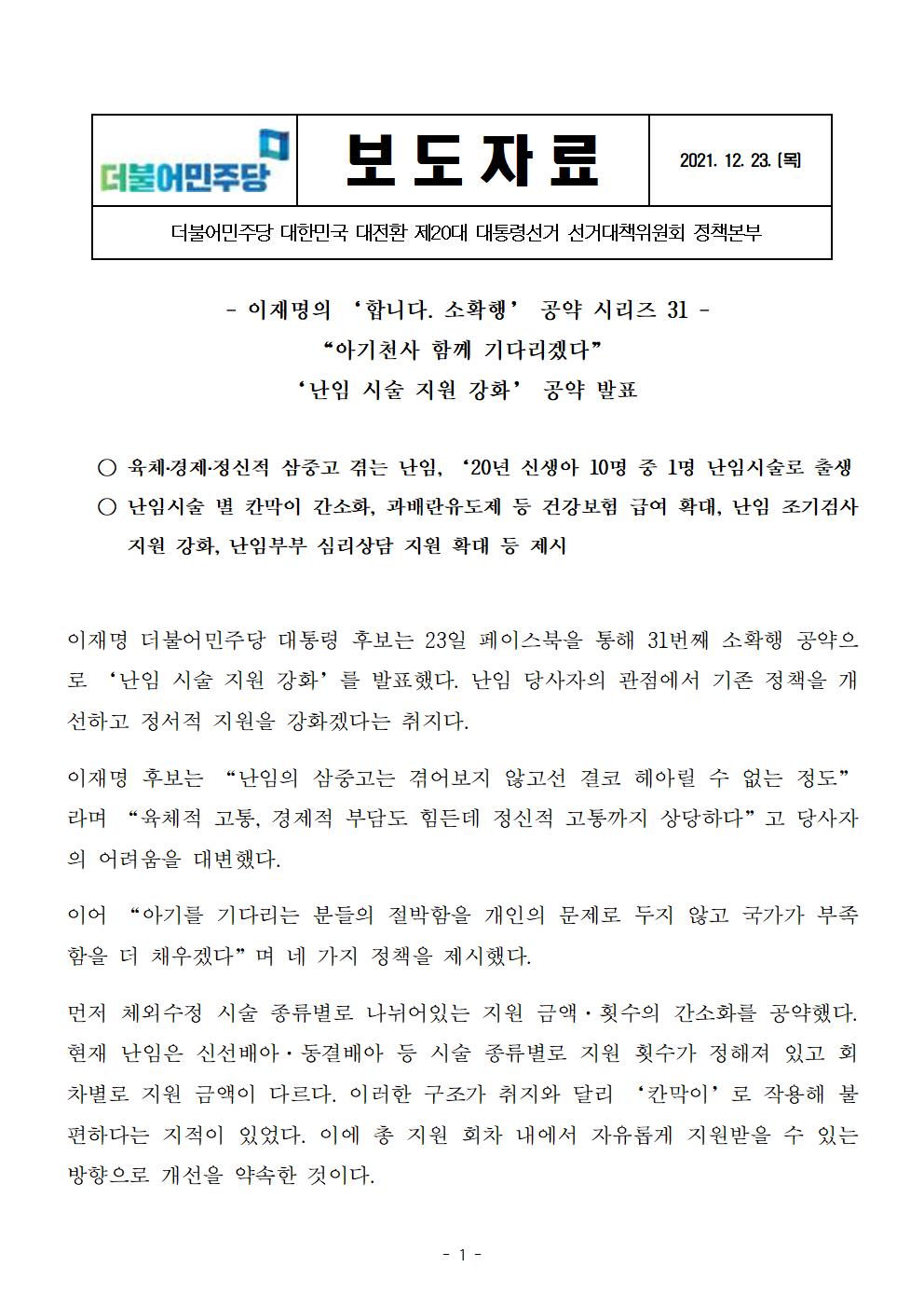 [보도자료] 더불어민주당 선대위 정책본부, '이재명의 합니다. 소확행 공약 시리즈 31' 난임시술 지원 강화 공약