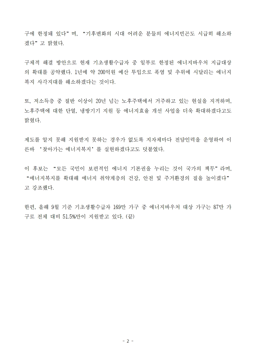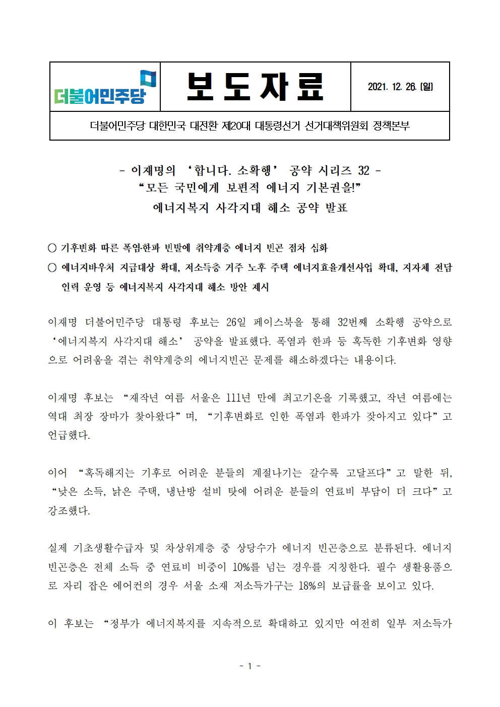 [보도자료] 더불어민주당 선대위 정책본부, '이재명은 합니다. 소확행 공약 시리즈 32' 에너지복지 사각지대 해소 공약