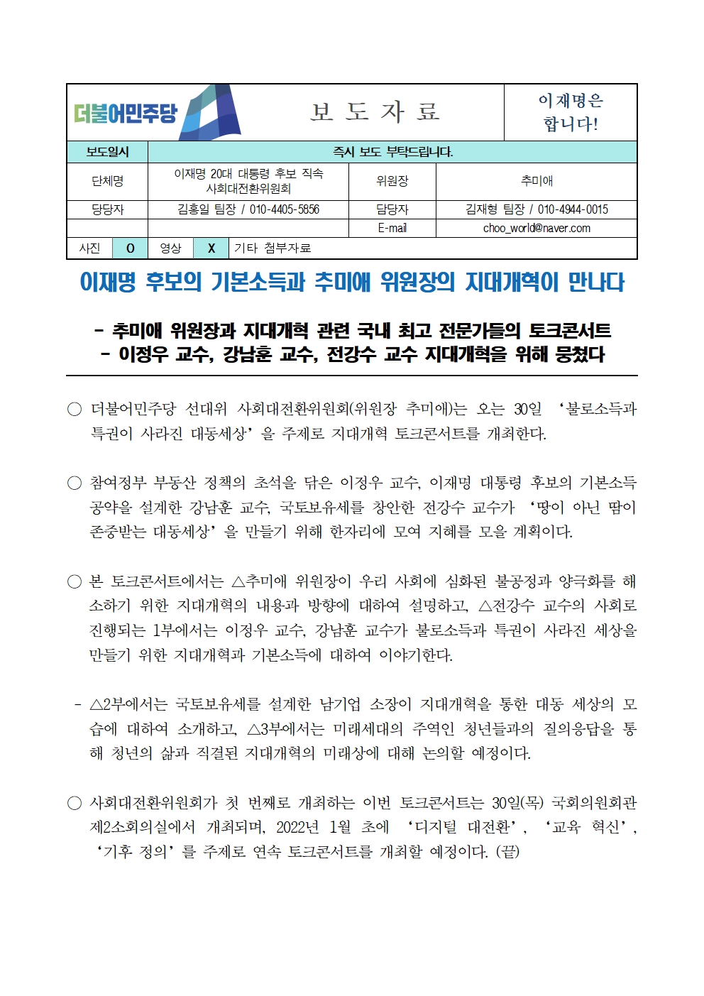 [보도자료] 더불어민주당 선대위 사회대전환위원회, 지대개혁 토크콘서트 개최