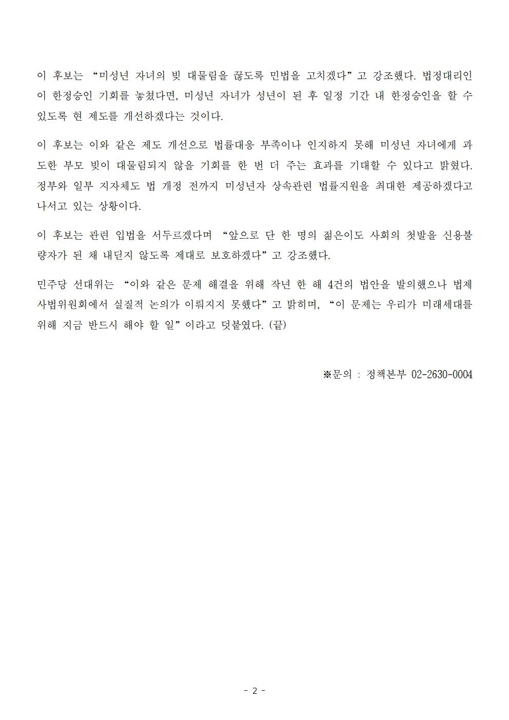 [보도자료] 더불어민주당 선대위 정책본부 이재명의 합니다. 소확행 공약 시리즈 44 미성년상속인의 부모 및 대물림 방지 공약 발표