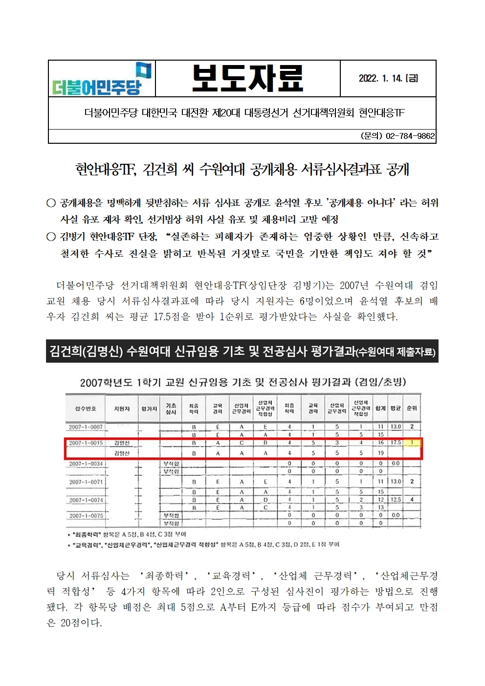 [보도자료] 더불어민주당 선대위 현안대응TF, 김건희 씨 수원여대 공개채용 서류심사결과표 공개