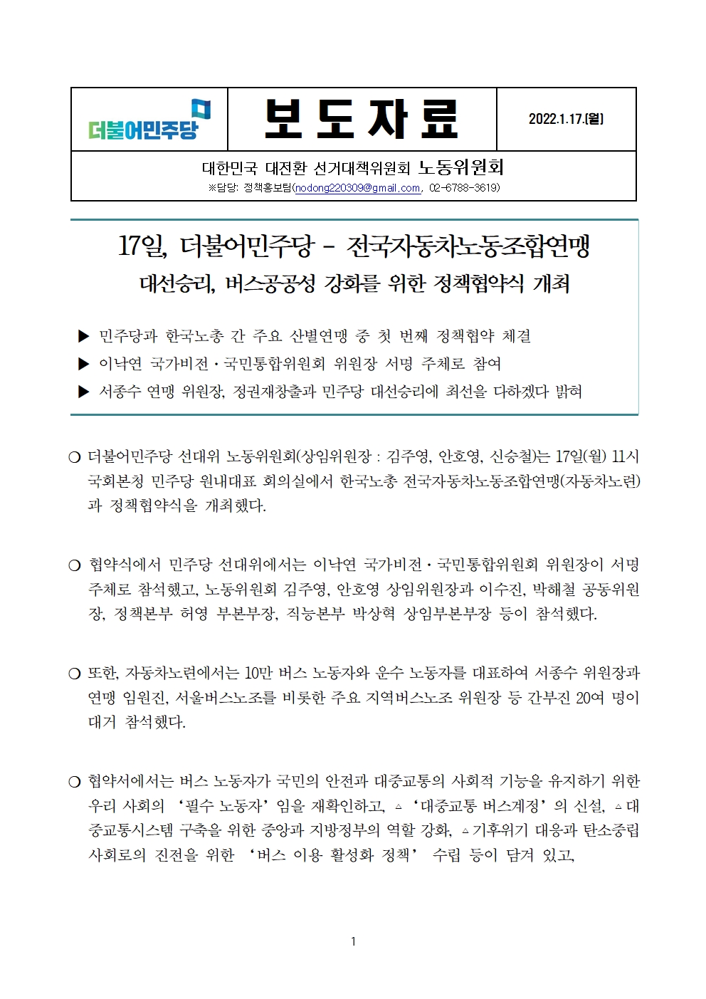 [보도자료] 더불어민주당 선대위 노동위원회, 전국자동차노동조합연맹과 정책협약식 개최