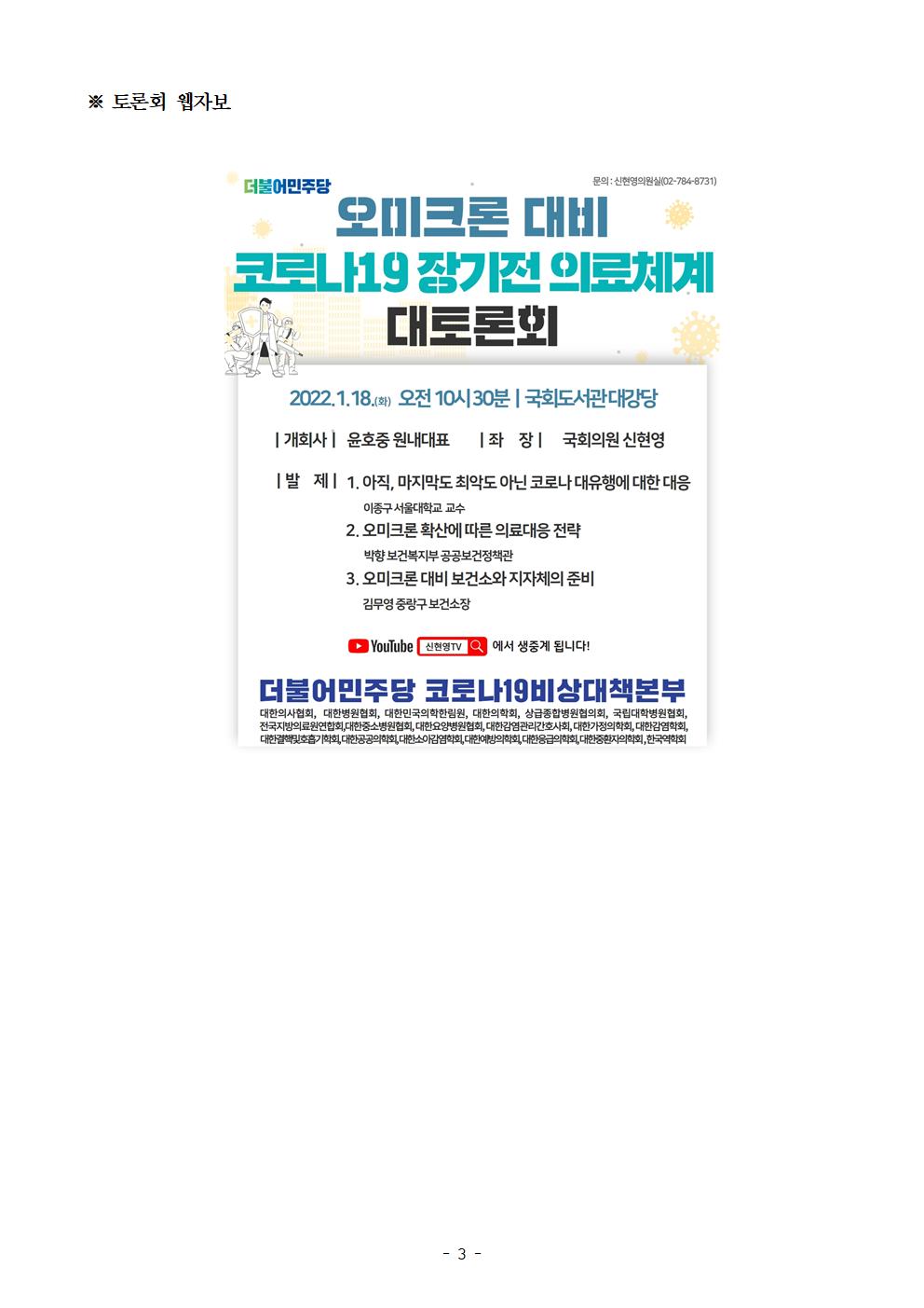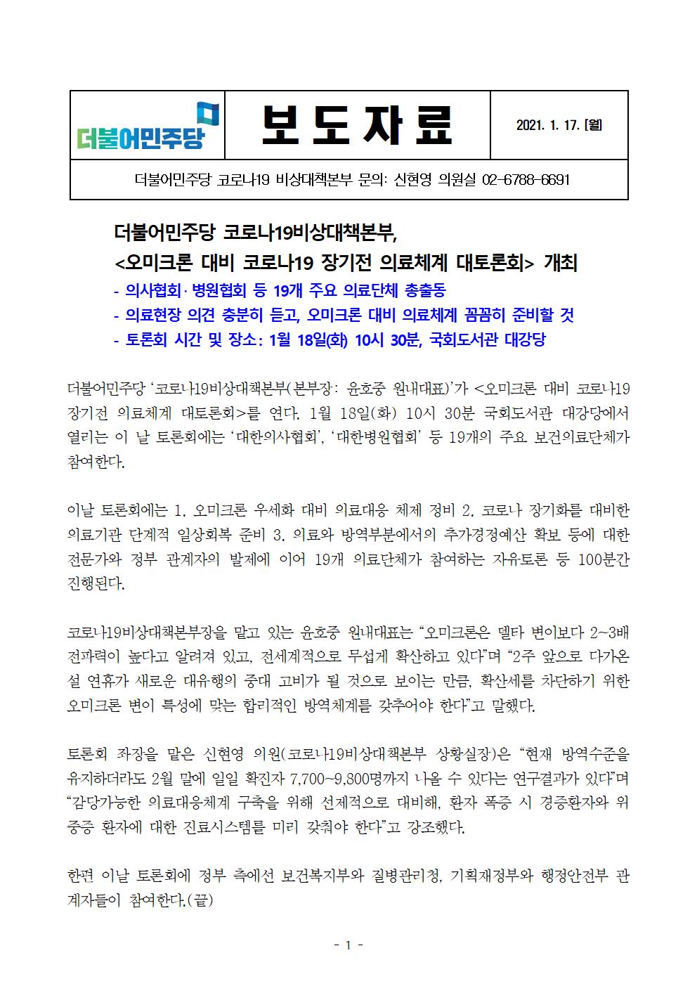 [보도자료] 더불어민주당 코로나19 비상대책본부 오미크론 대비 코로나 19 장기전 의료체계 대토론회 개최
