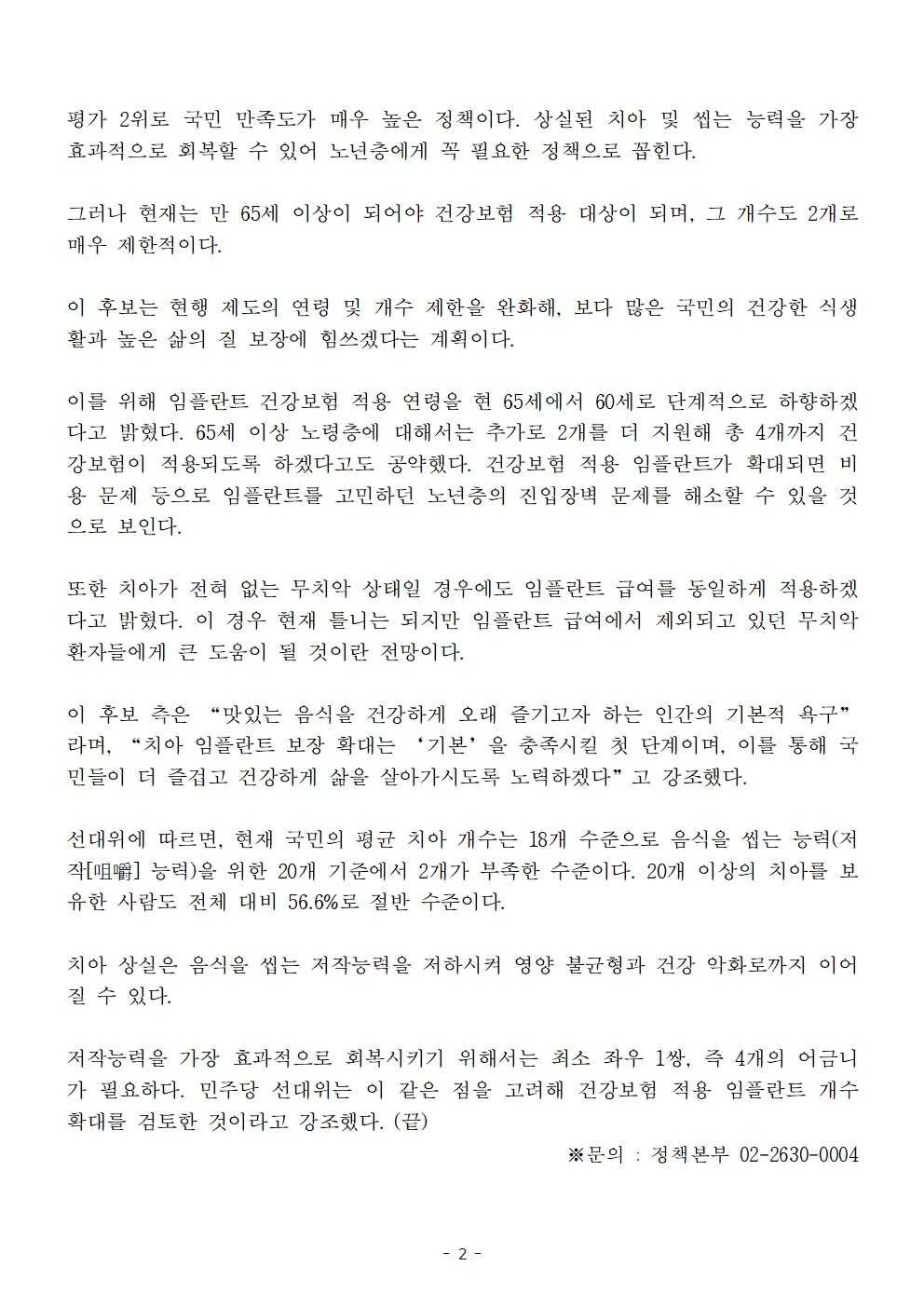 [보도자료] 더불어민주당 선대위 정책본부, '이재명은 합니다. 소확행 공약 시리즈 49' 치아 임플란트 건강보험 확대 공약