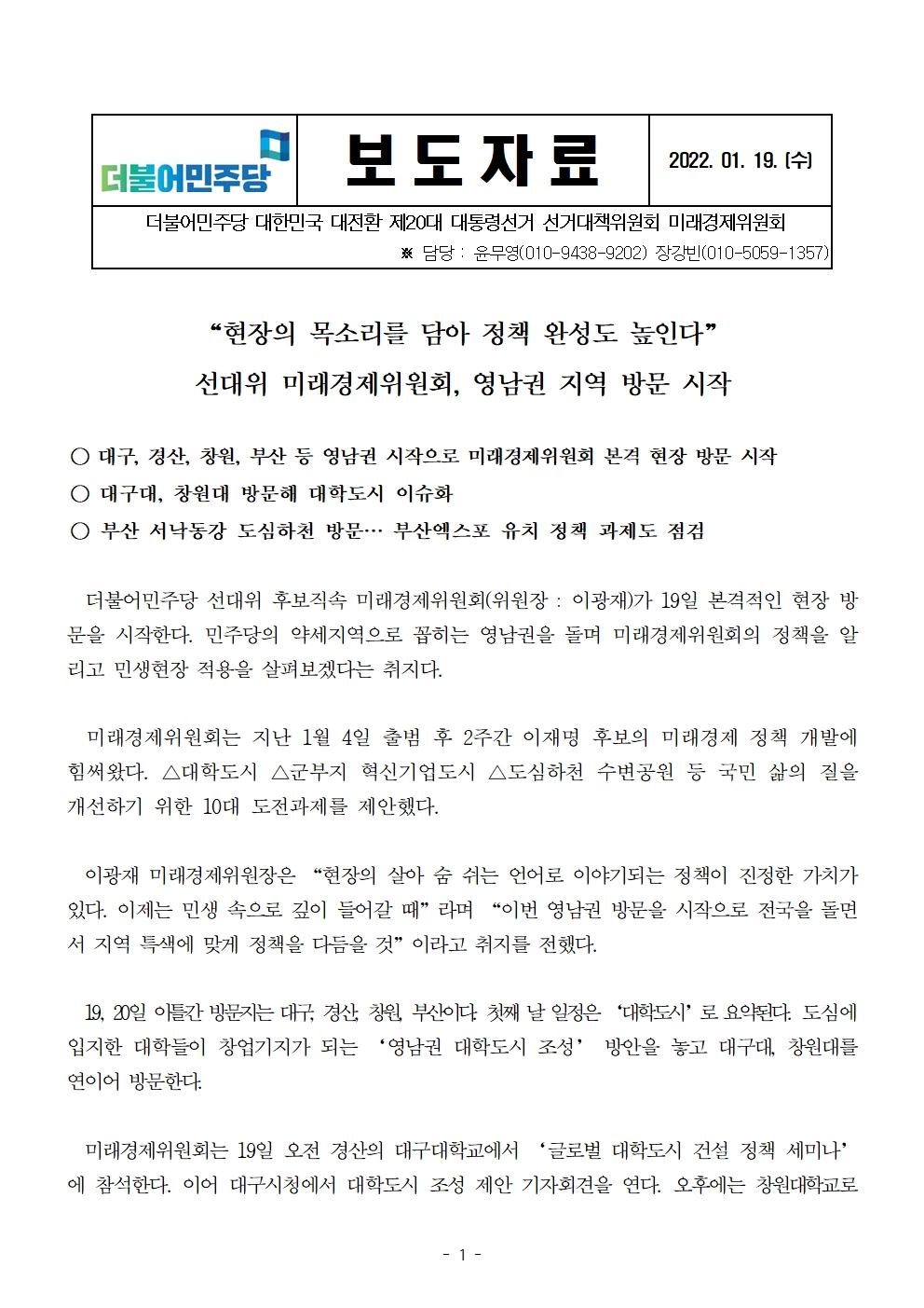 [보도자료] 더불어민주당 선대위 미래경제위원회, 영남권 지역 방문 시작