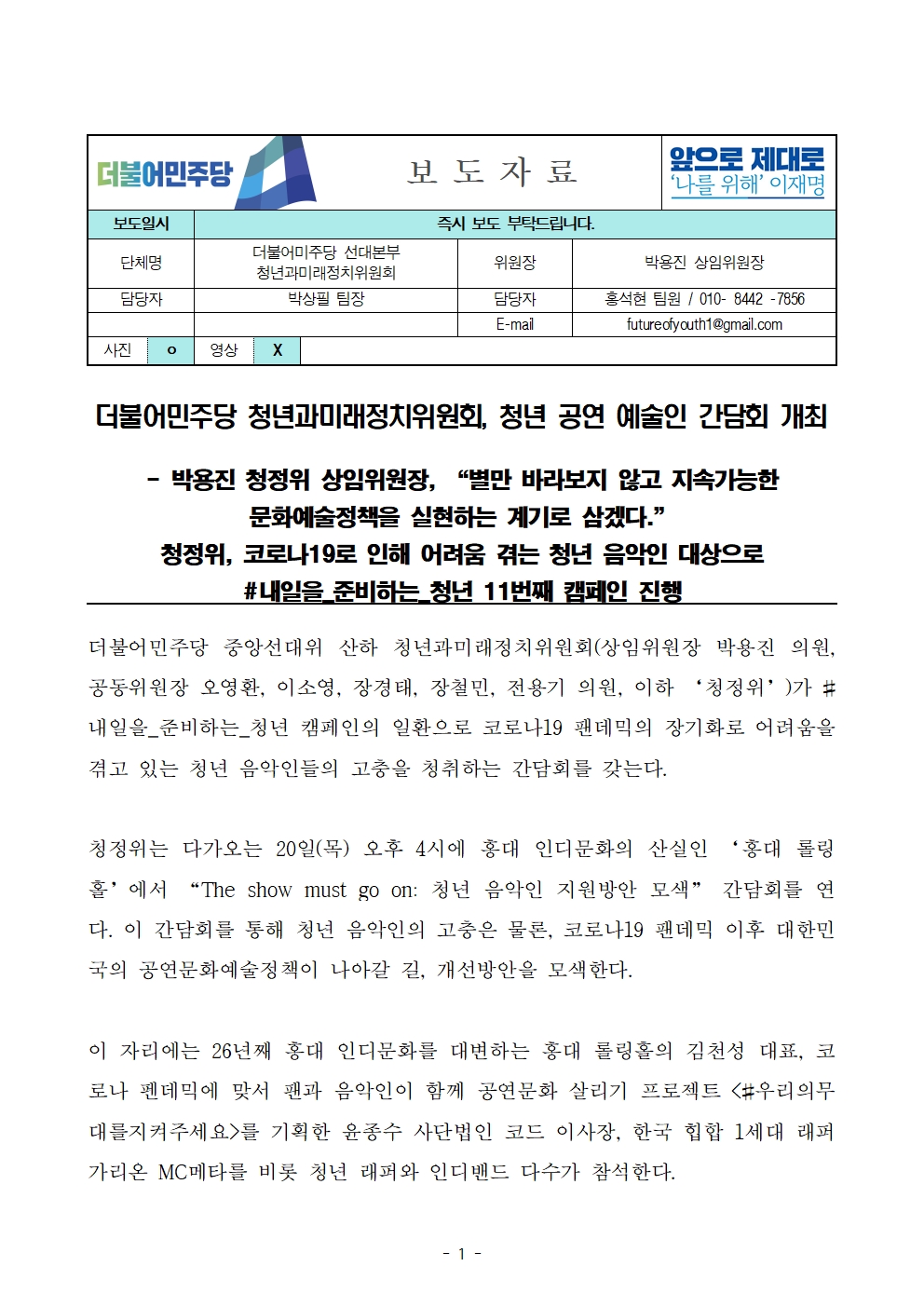 [보도자료] 더불어민주당 선대위 청년과미래정치위원회, 청년 공연 예술인 간담회 개최