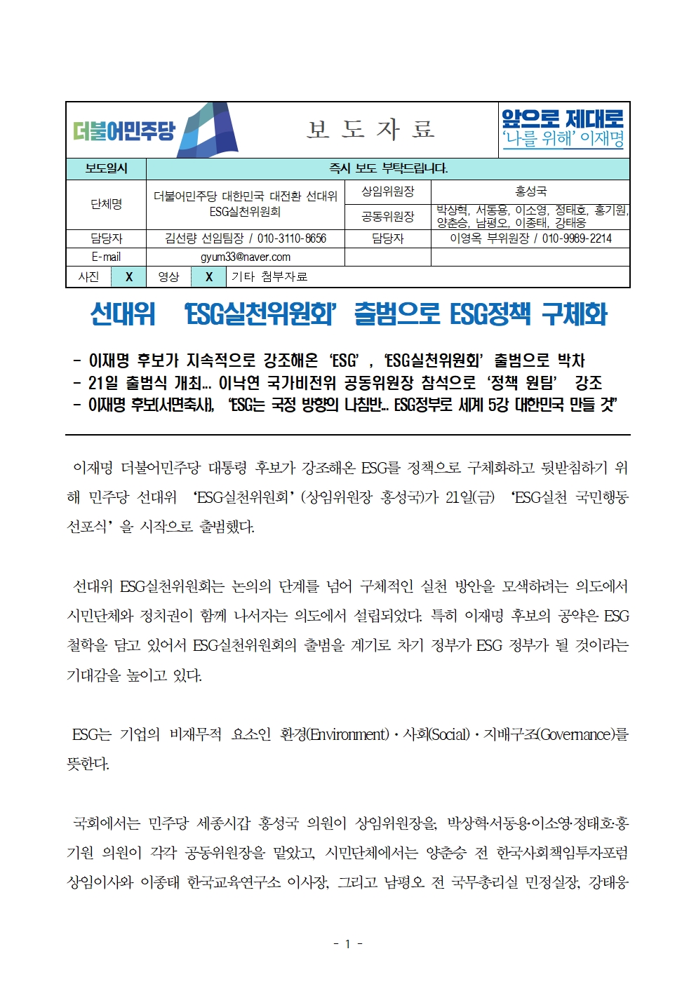 [보도자료] 더불어민주당 선대위 ESG실천위원회 출범