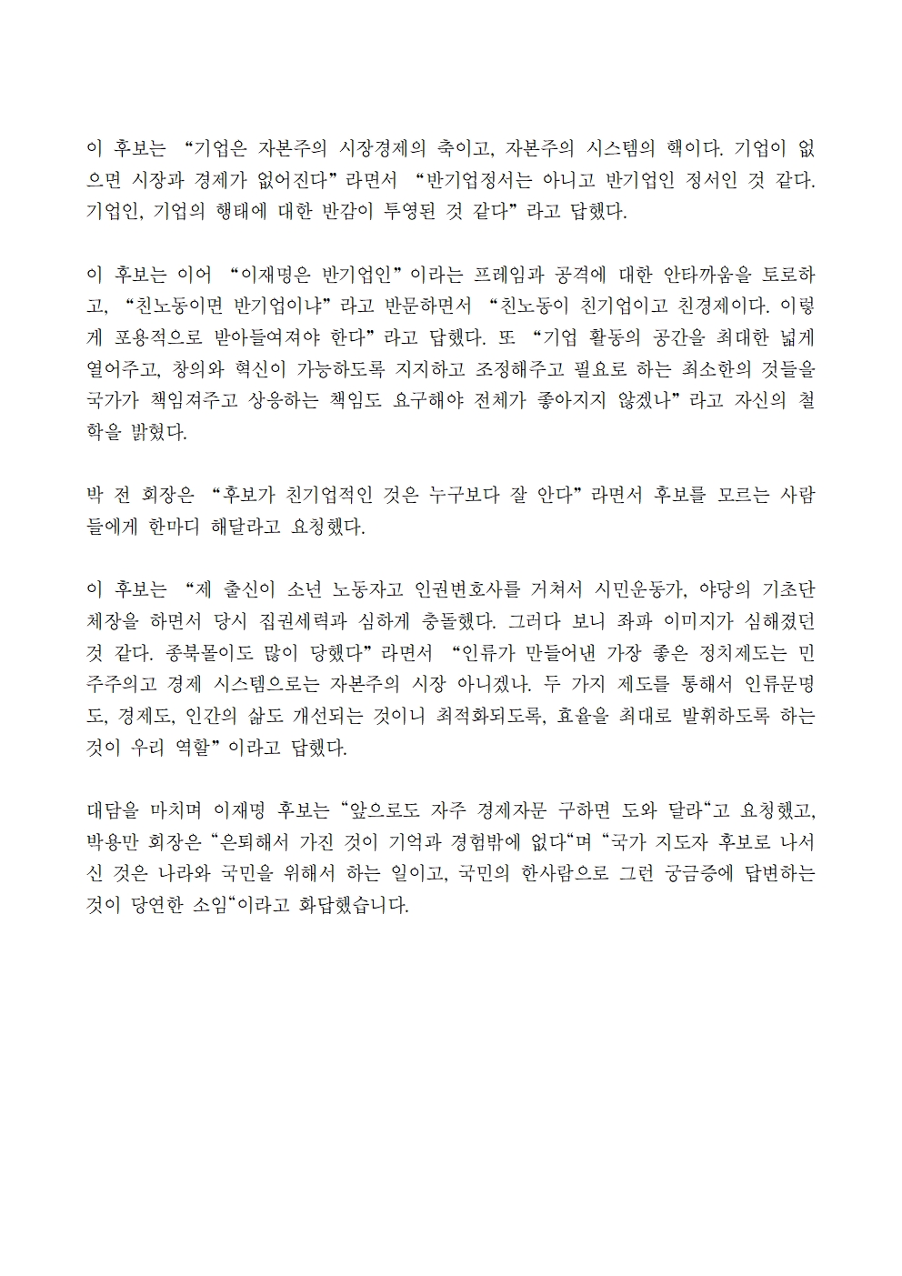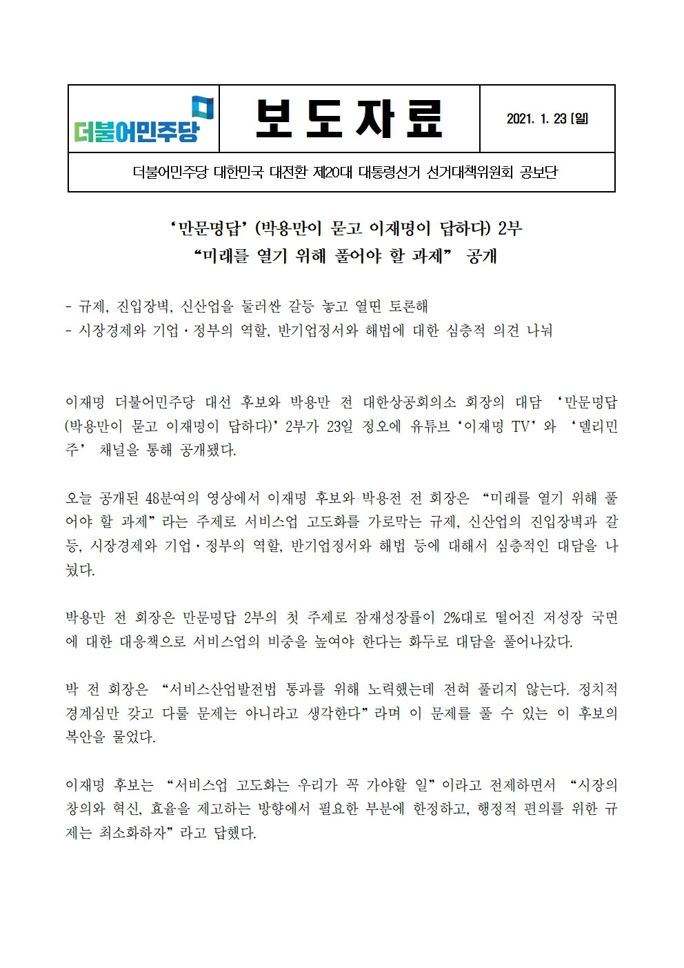 [보도자료] 더불어민주당 선대위 공보단, '만문명답(박용만이 묻고 이재명이 답하다)' 2부 "미래를 열기 위해 풀어야 할 과제" 공개