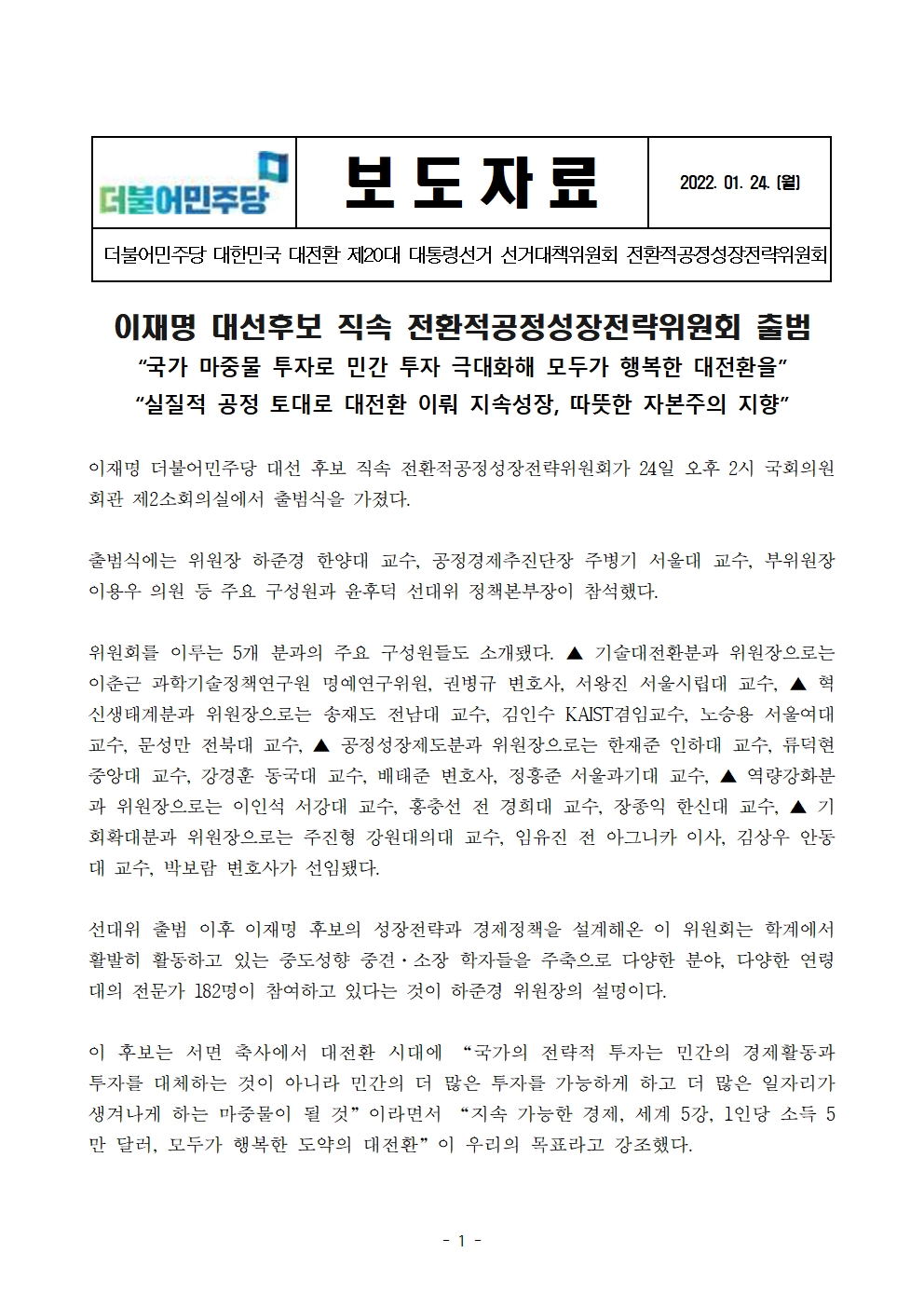 [보도자료] 더불어민주당 선대위 전환적공정성장전략위원회 출범식 개최
