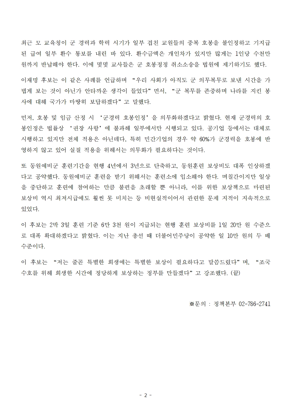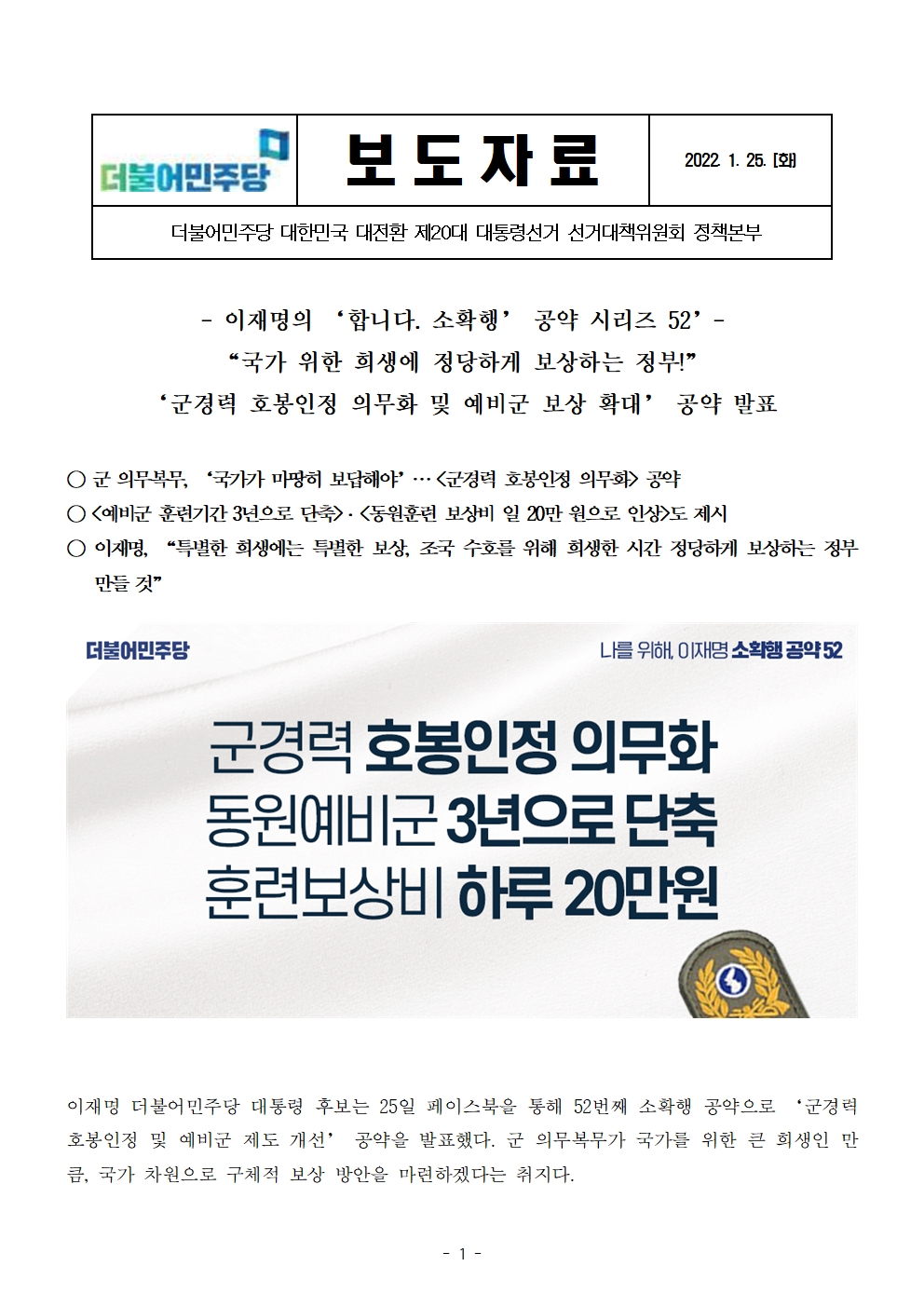 [보도자료] 더불어민주당 선대위 정책본부, '이재명은 합니다. 소확행 공약 시리즈 52' 군필자 호봉인정 의무화 및 예비군 보상 확대