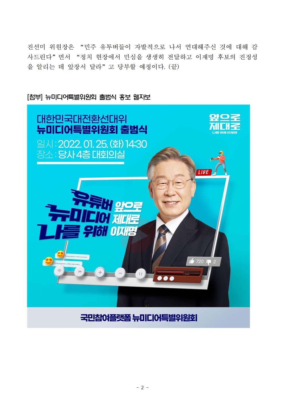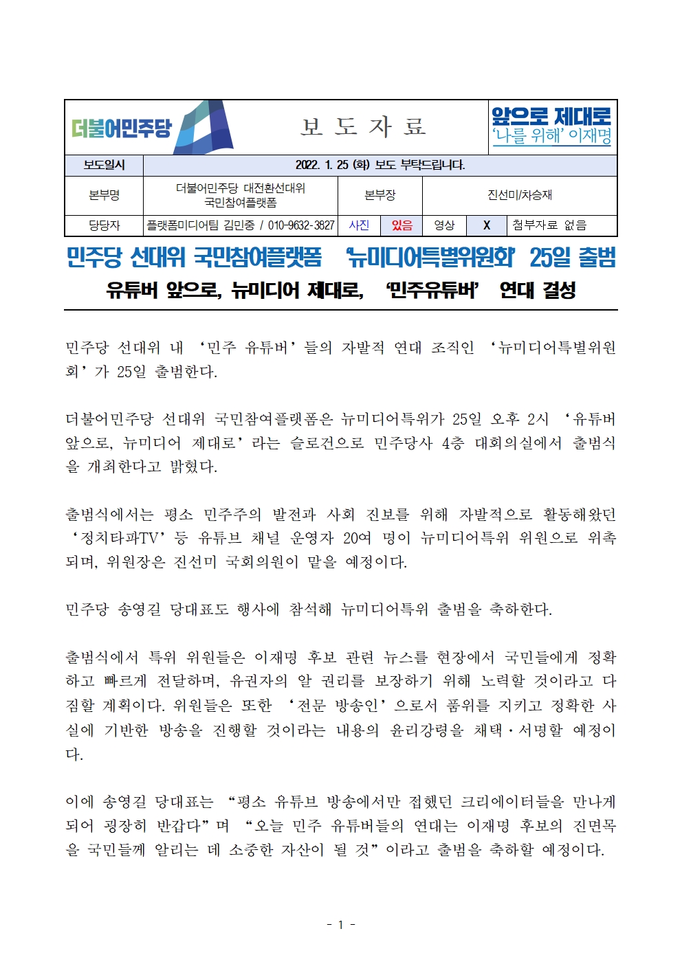 [보도자료] 더불어민주당 선대위 국민참여플랫폼 뉴미디어특별위원회 출범