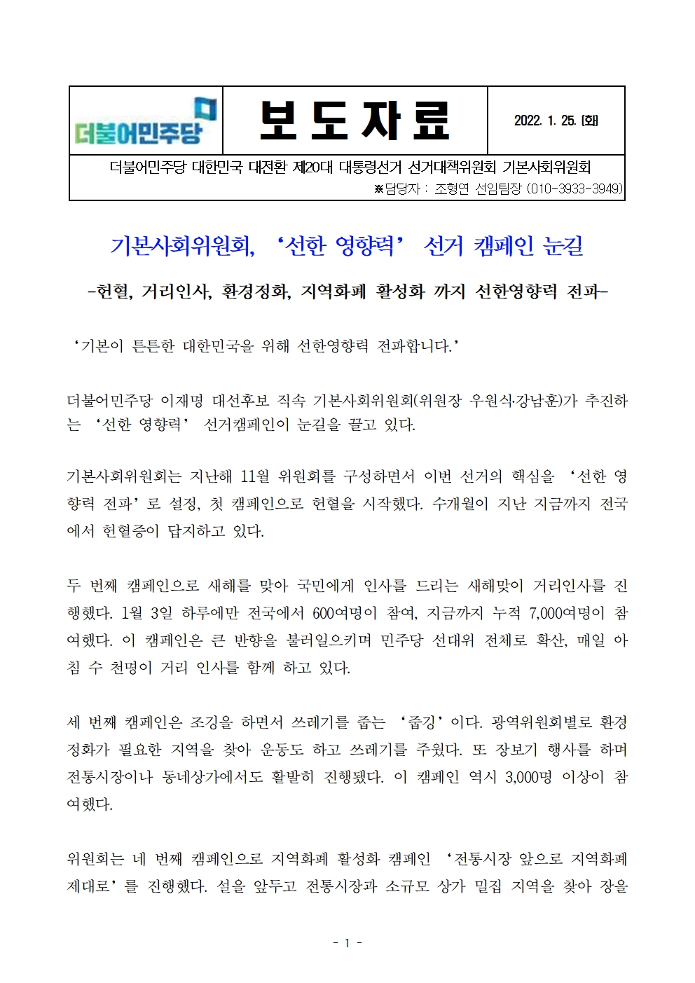 [보도자료] 더불어민주당 선대위 기본사회위원회, '선한 영향력' 선거 캠페인 눈길