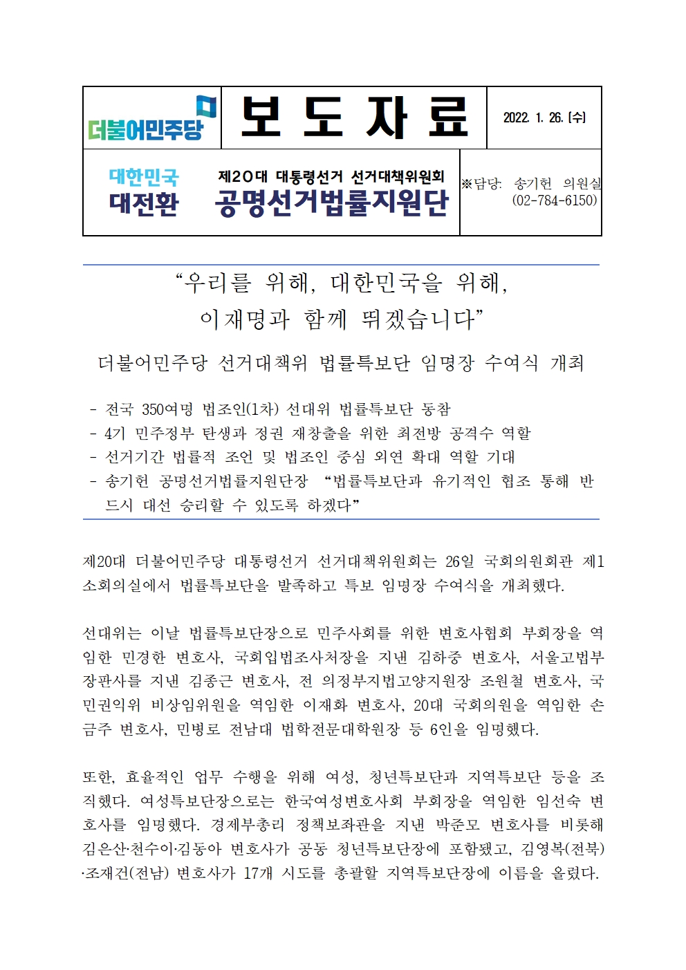 [보도자료]더불어민주당 선거대책위 법률특보단 임명장 수여식 개최