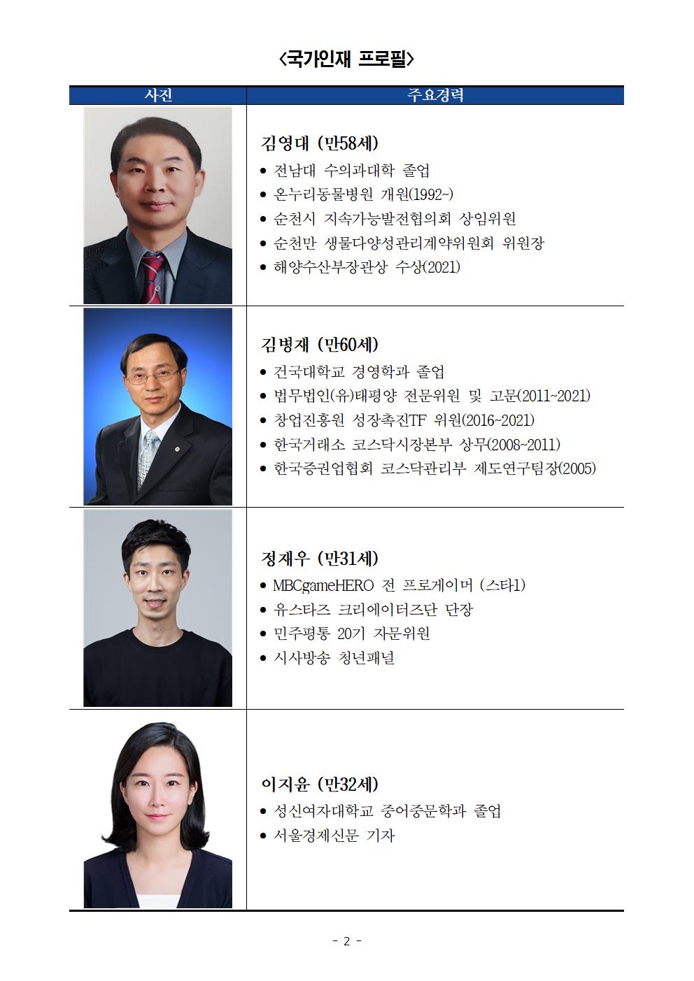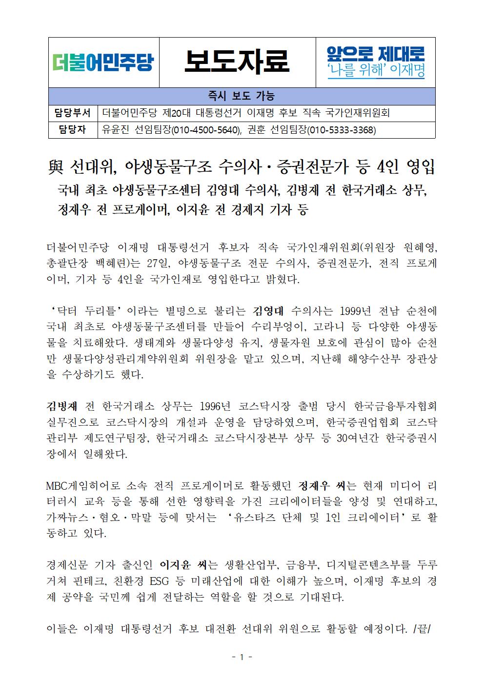 [보도자료] 더불어민주당 선대위 국가인재위원회 야생동물, 증권전문가등 4인 영입