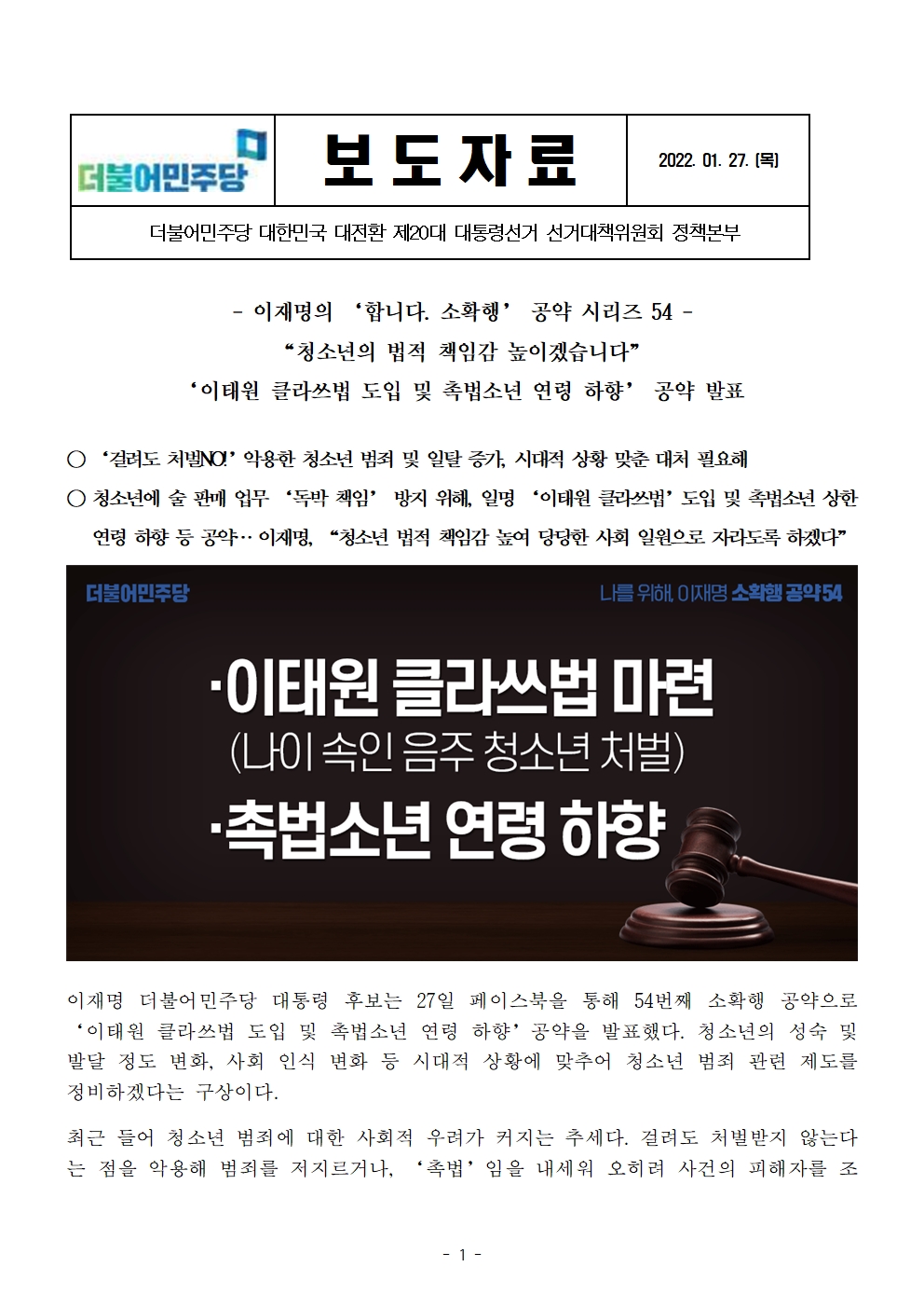 [보도자료] 더불어민주당 선대위 정책본부, '이재명은 합니다. 소확행 공약 시리즈 54' 나이 속인 음주 청소년 처벌 및 촉법소년 연령 하향 공약 발표