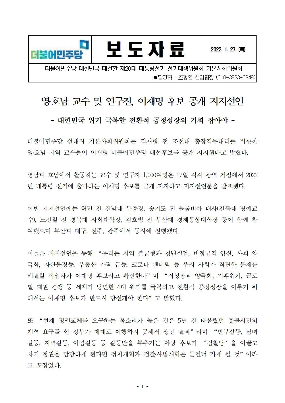 [보도자료] 더불어민주당 선대위 기본사회위원회, 영·호남 교수 및 연구진, 후보 지지선언