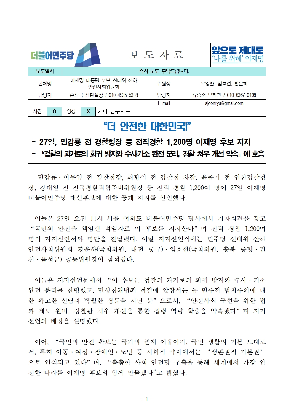 [보도자료] 더불어민주당 선대위 안전사회위원회, 전직경찰 1200명 후보 지지 선언