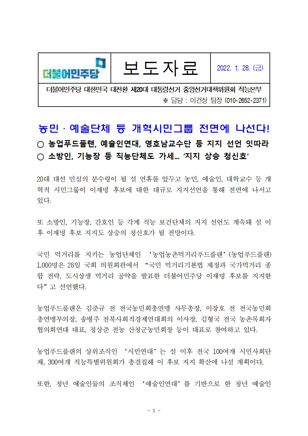[보도자료] 더불어민주당 선대위 직능본부, 농민·예술단체 등 개혁시민그룹 대규모 지지선언