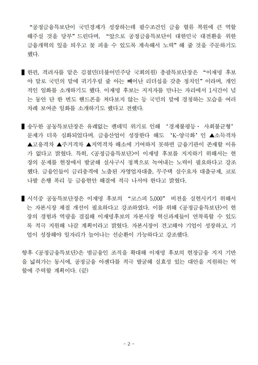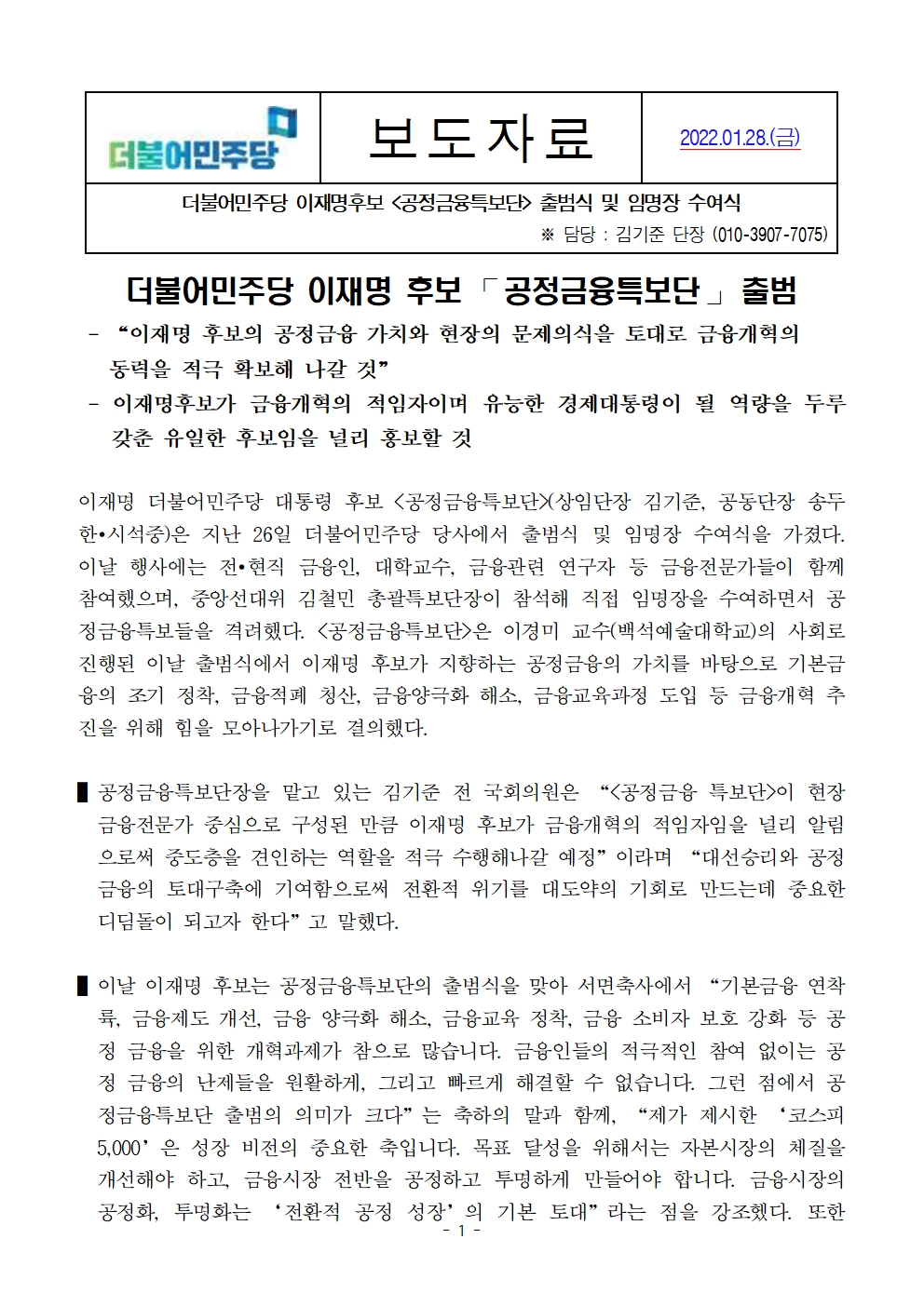 [보도자료] 더불어민주당 선대위 공정금융특보단 출범