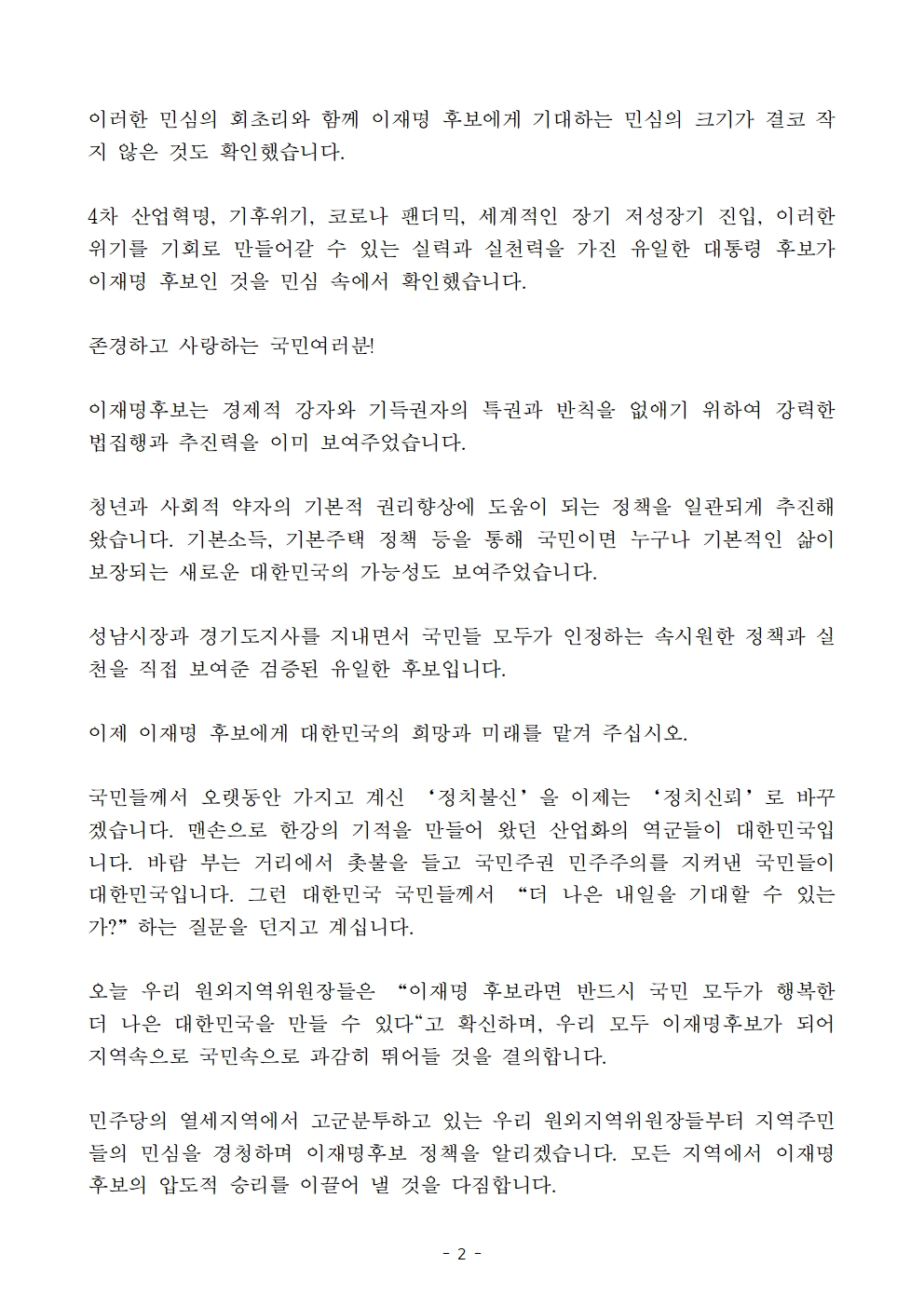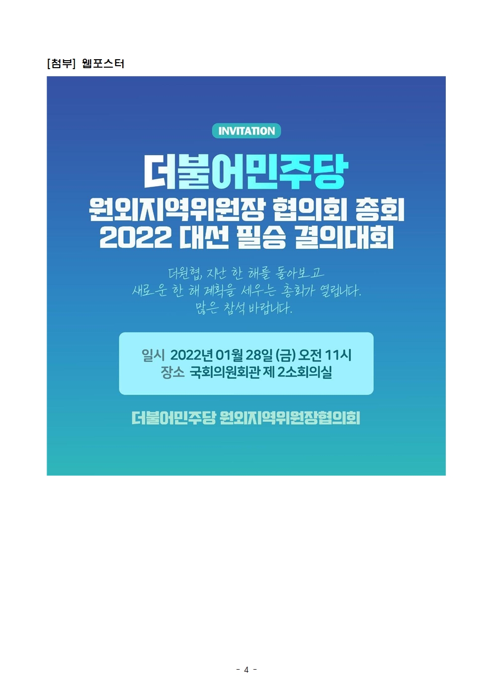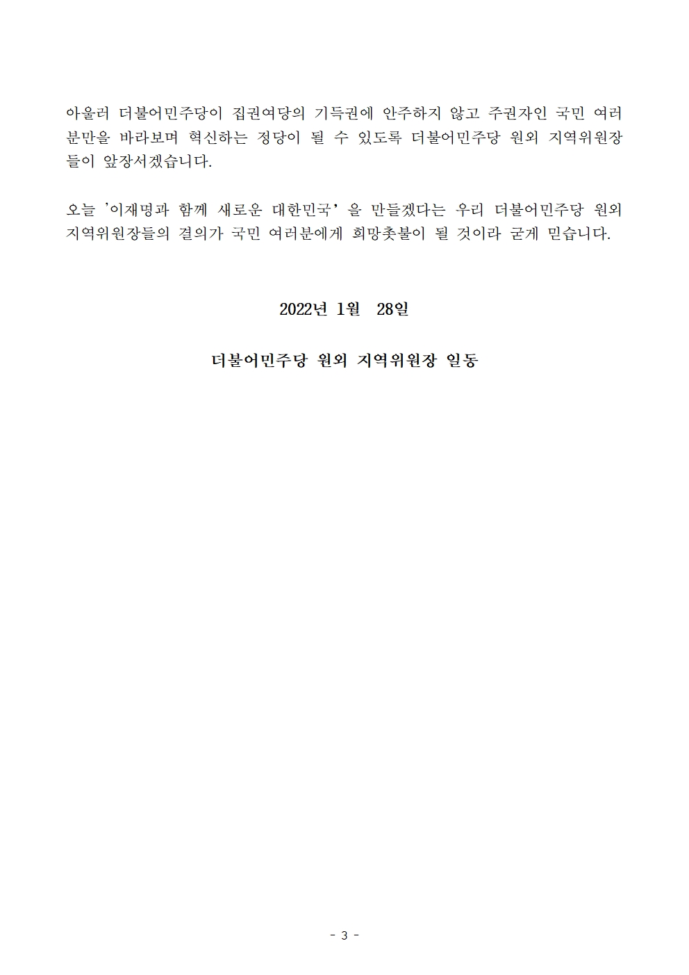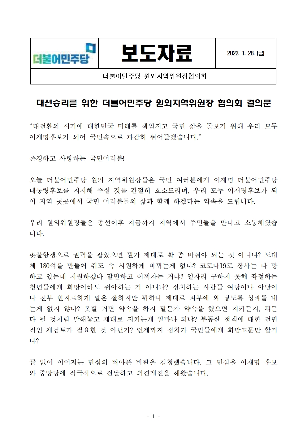 [보도자료] 더불어민주당 원외지역위원장협의회, 2022 대선 필승 결의대회 개최