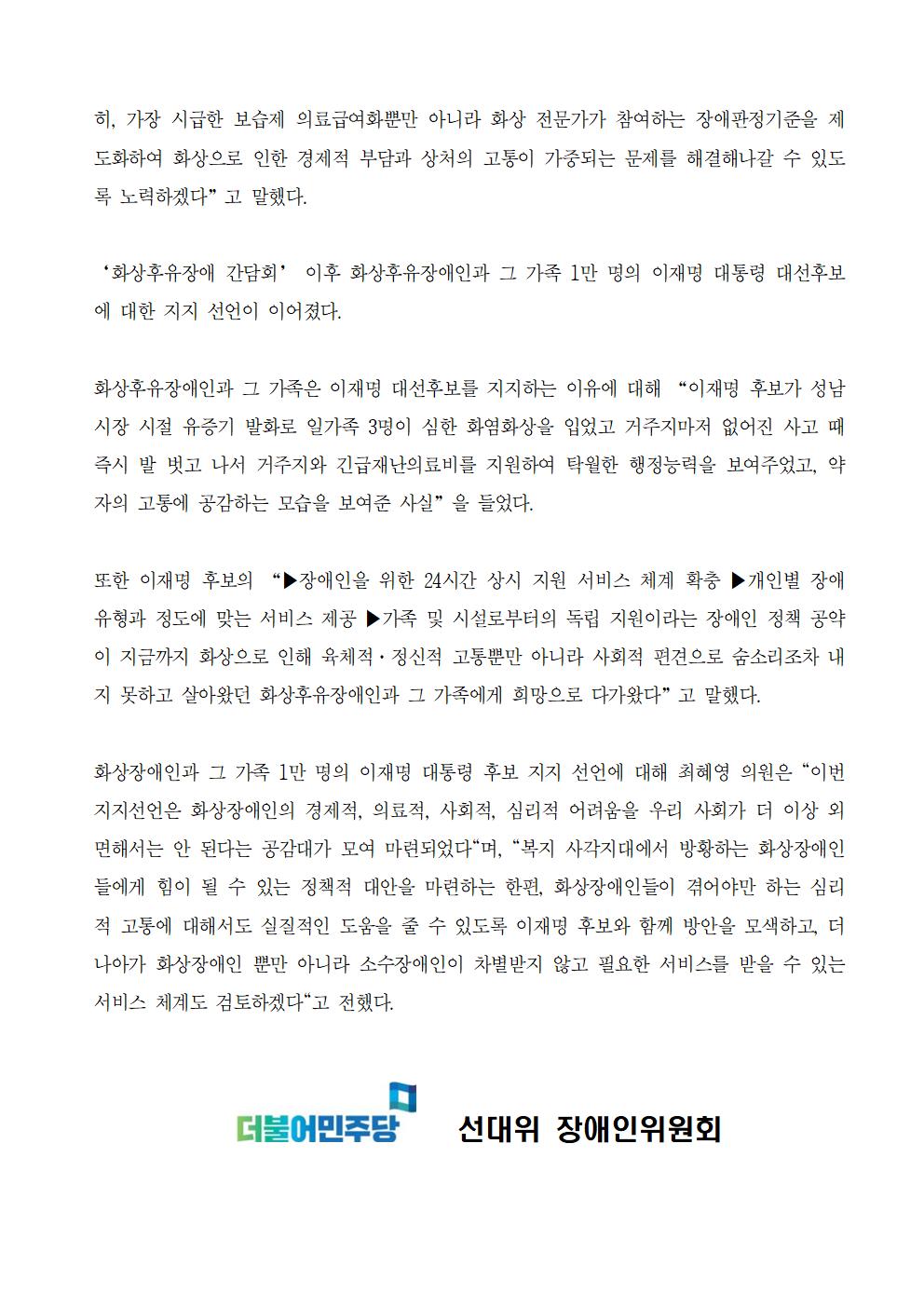 [보도자료] 더불어민주당 선대위 장애인위원회 화상후유장애인 1만인 이재명후보 지지 선언