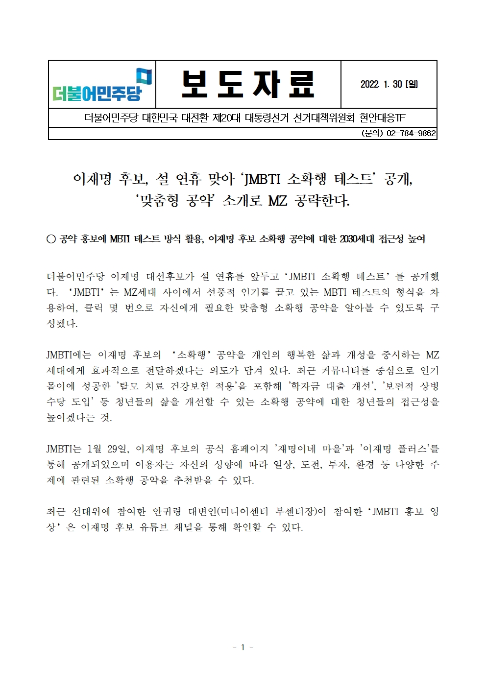 [보도자료] 더불어민주당 선대위 현안대응TF, 이재명 후보, 설 연휴 맞아 ‘JMBTI 소확행 테스트’ 공개, ‘맞춤형 공약’ 소개로 MZ 공략한다.