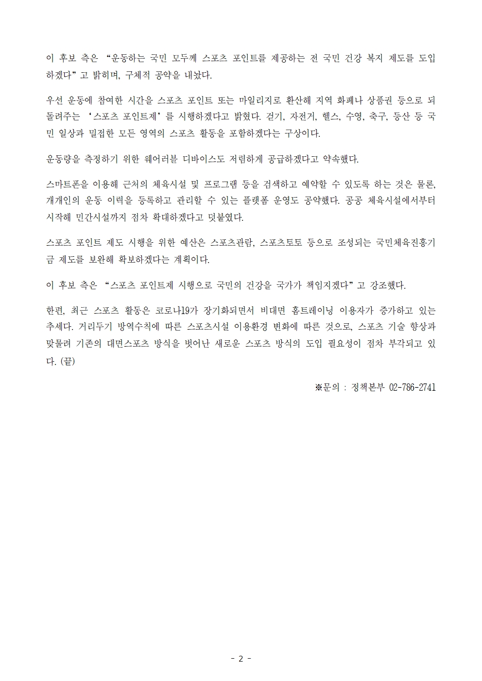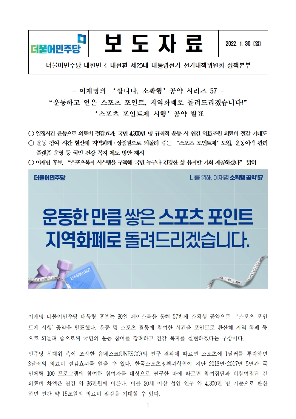 [보도자료] 더불어민주당 선대위 정책본부, '이재명은 합니다. 소확행 공약 시리즈 57' 스포츠 포인트제 시행 공약 발표