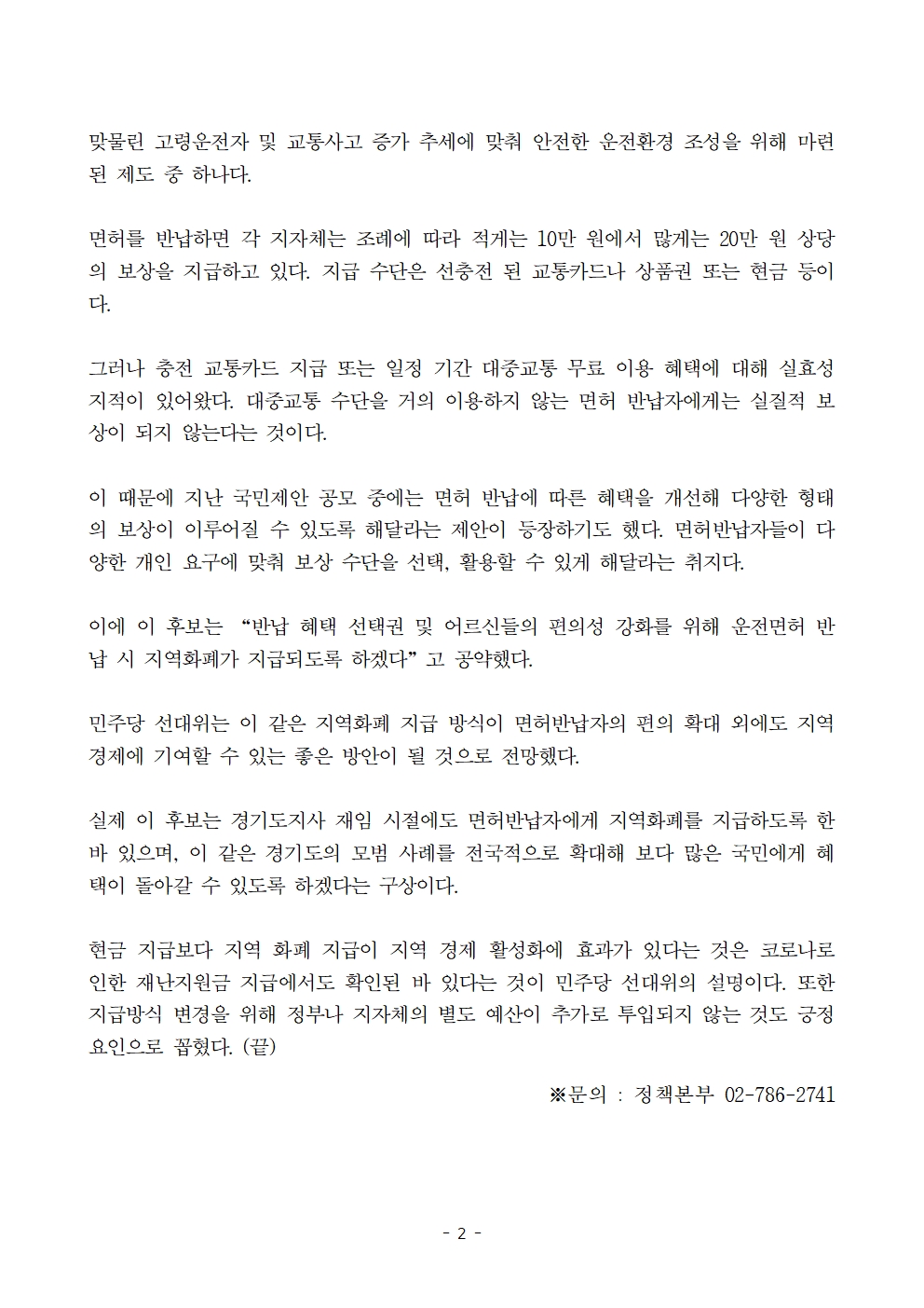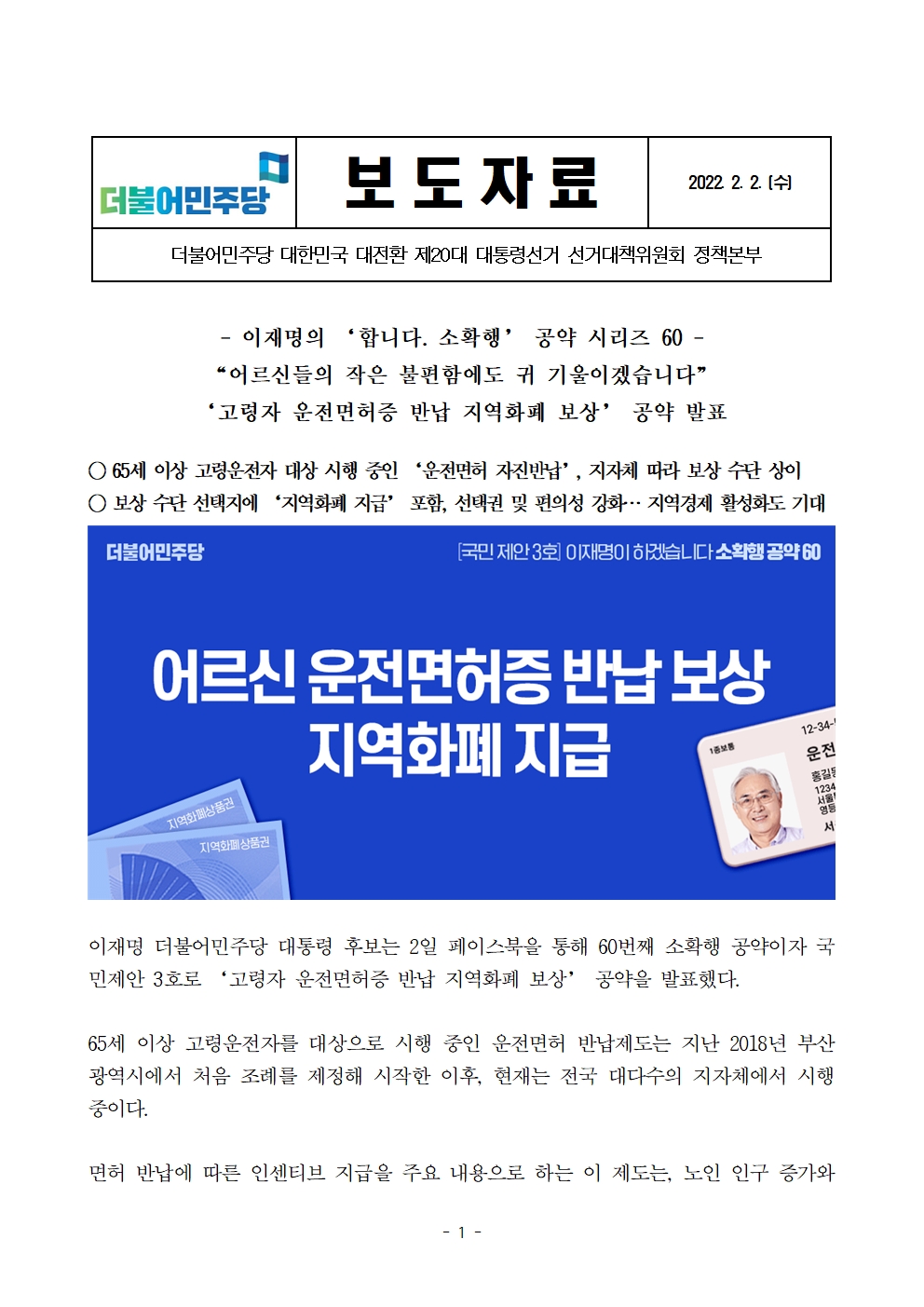 [보도자료] 더불어민주당 선대위 정책본부, '이재명은 합니다. 소확행 공약 시리즈 60' 고령자 운전면허증 반납 지역화폐 보상 공약 발표