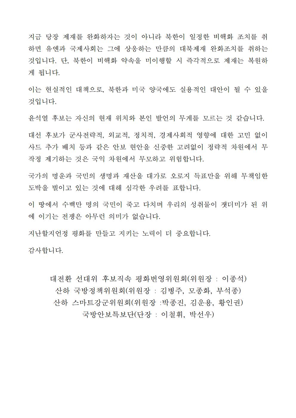 [기자회견문] 더불어민주당 선대위 평화번영위원회 윤석열 후보의 사드 수도권 추가 배치 공약