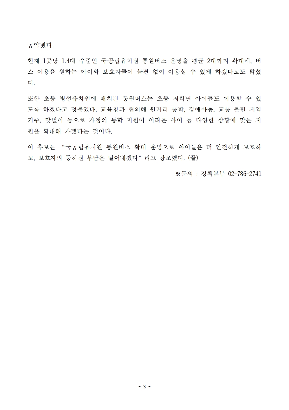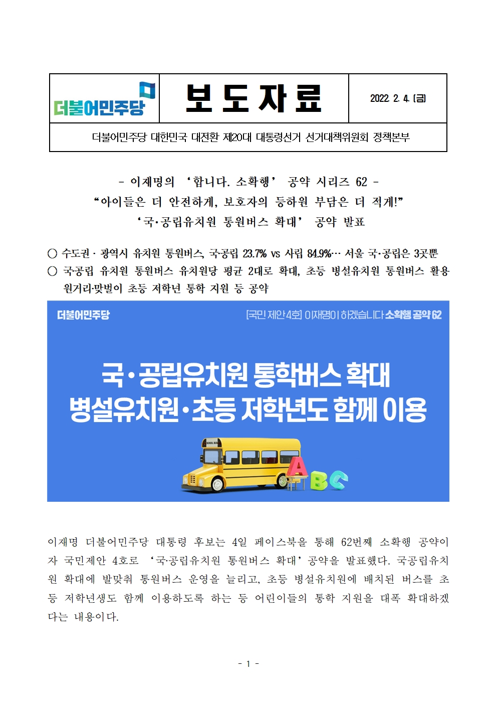 [보도자료] 더불어민주당 선대위 정책본부, '이재명은 합니다. 소확행 공약 시리즈 62' 국·공립유치원 통원버스 확대 공약 발표