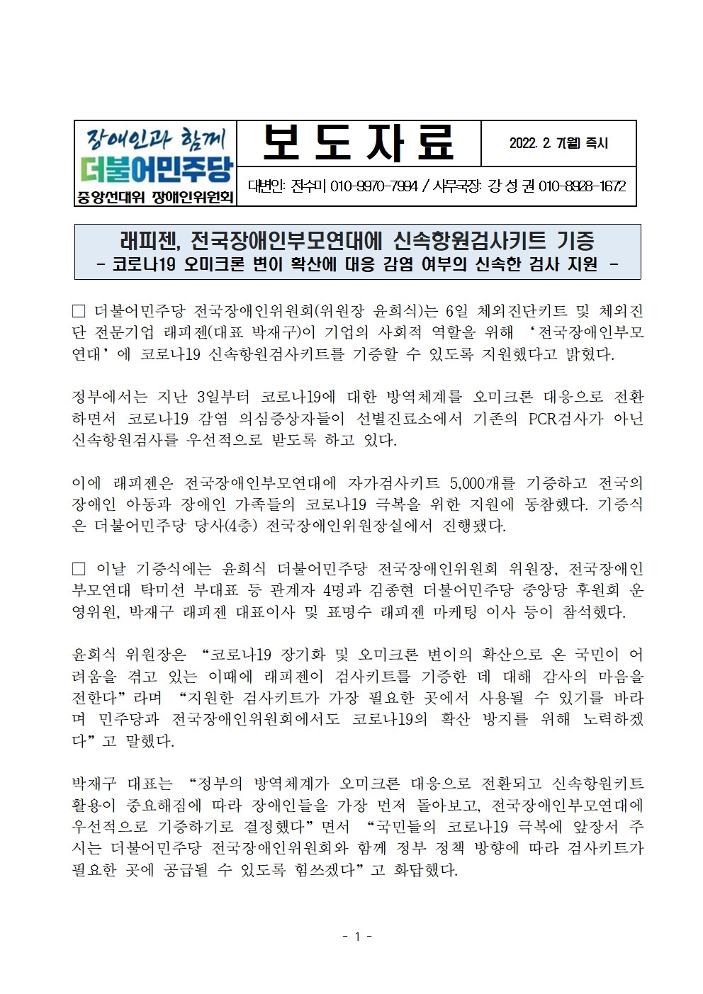 [보도자료] 더불어민주당 선대위 전국장애인위원회, 래피젠, 전국장애인부모연대에 신속항원검사키트 기증 지원