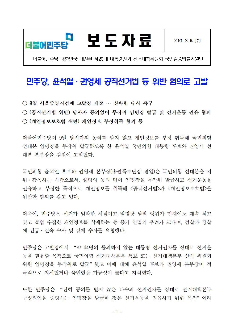 220209_보도자료_더불어민주당_윤석열,권영세_공직선거법_등_위반혐의로_고발.pdf