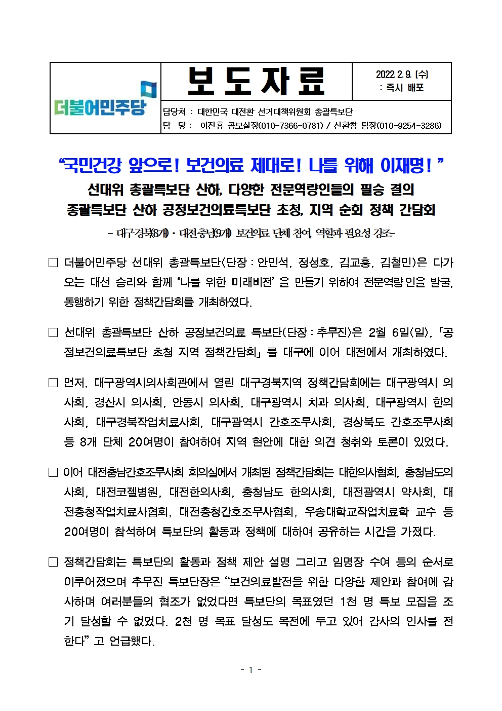 [보도자료] 더불어민주당 선대위 총괄특보단, 공정보건의료·스마트미래도시·미래사이버안보 관련 전문역량인 정책토론회 개최