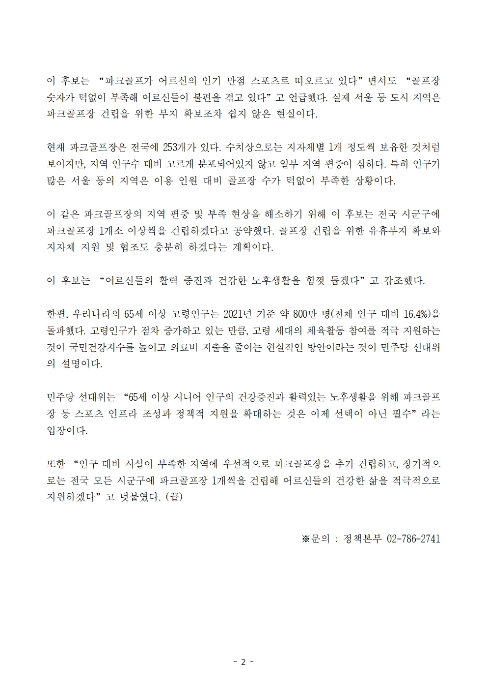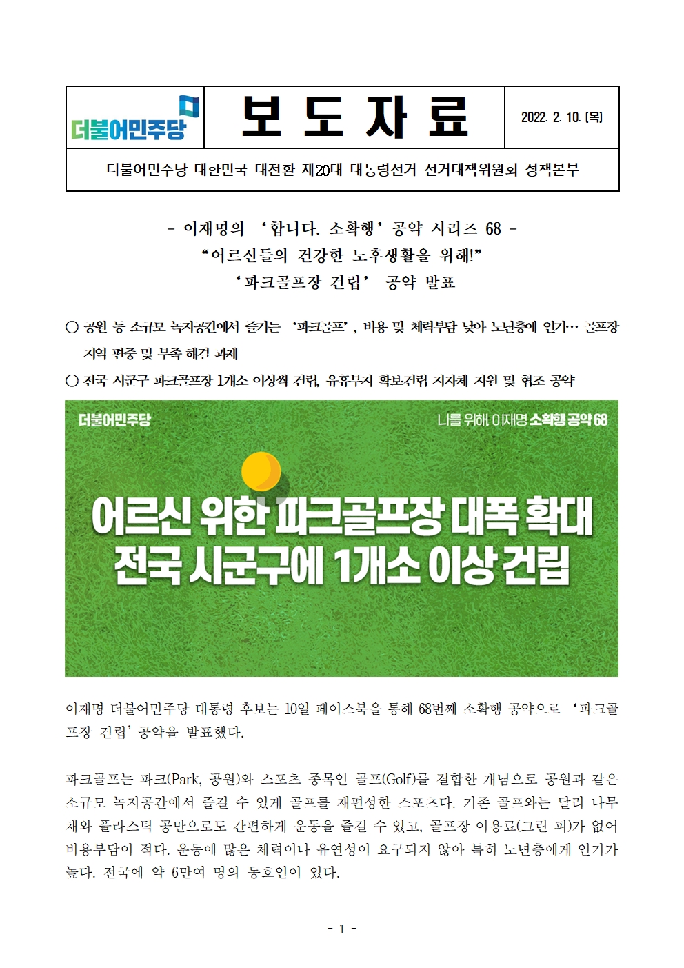 [보도자료] 더불어민주당 선대위 정책본부, '이재명은 합니다. 소확행 공약 시리즈 68' 파크골프장 건립 공약 발표