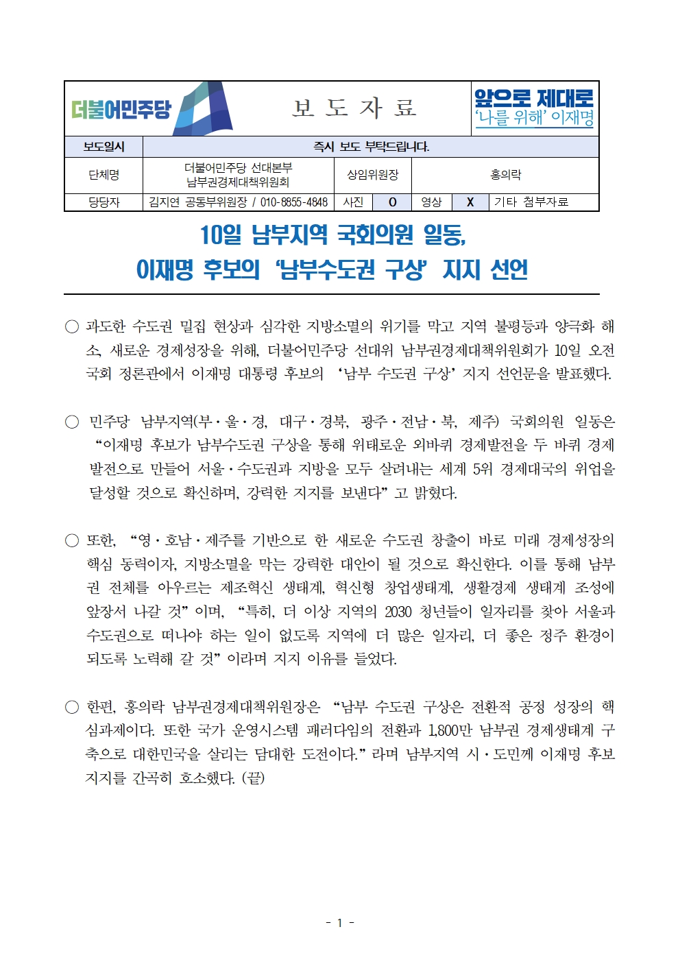 [보도자료] 더불어민주당 선대위 남부권경제대책위원회, 남부지역 국회의원 일동 '남부수도권 구상' 지지 선언