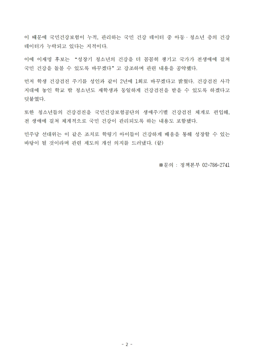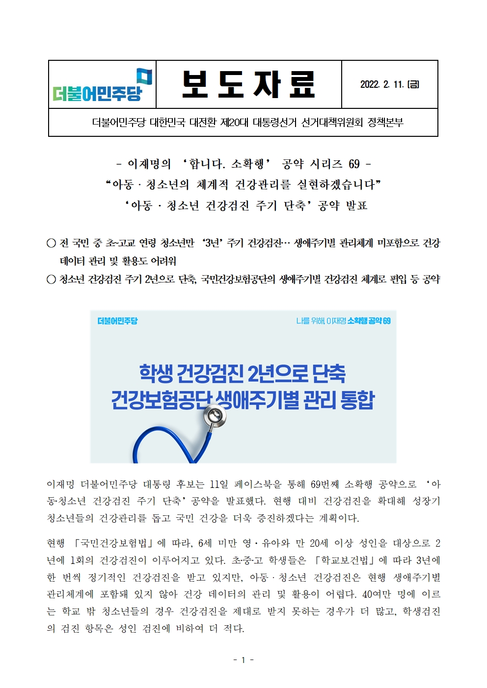 [보도자료] 더불어민주당 선대위 정책본부, '이재명은 합니다. 소확행 공약 시리즈 69' 아동·청소년 건강검진 주기 단축 공약 발표