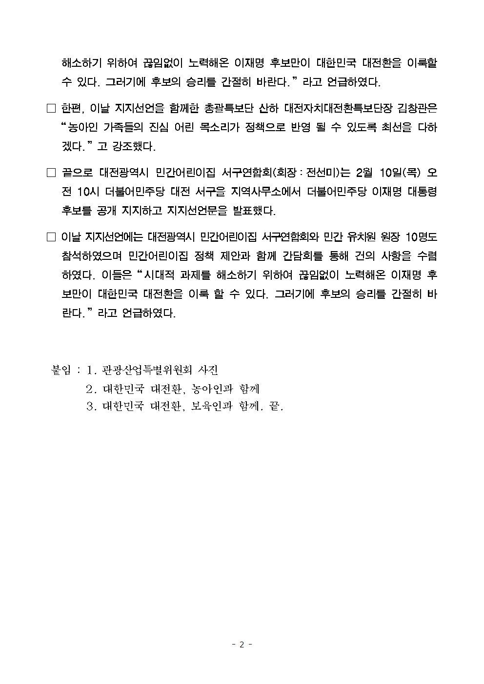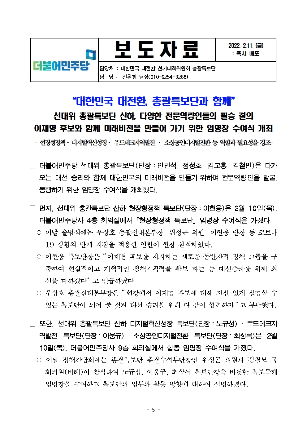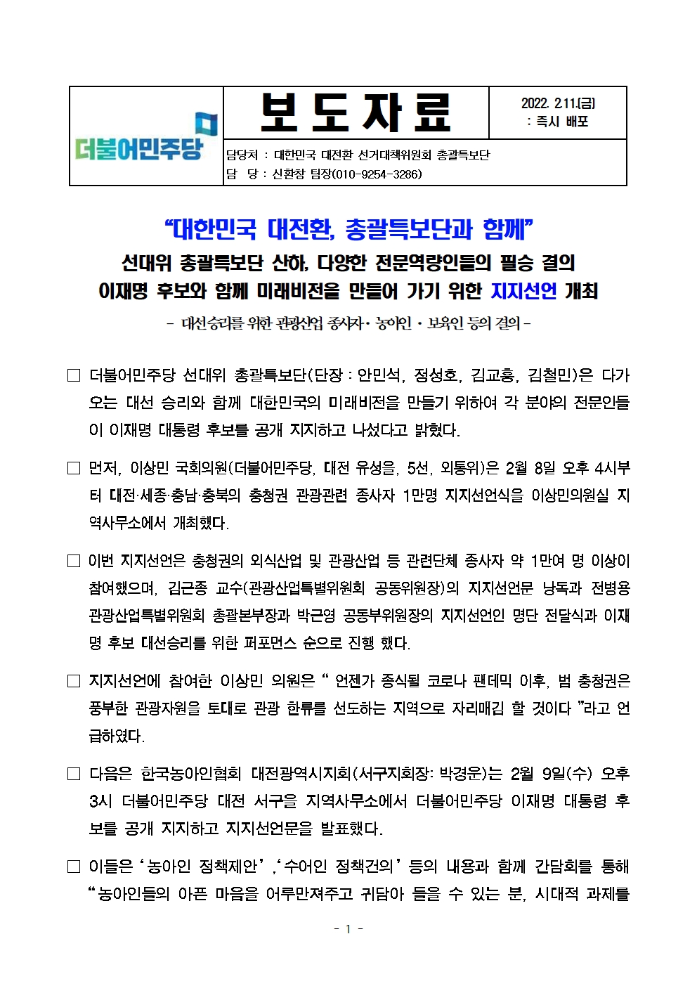 [보도자료] 더불어민주당 선대위 총괄특보단, 관광·농아·보육 및 정책·디지털·푸드테크 관련 전문역량인 지지선언