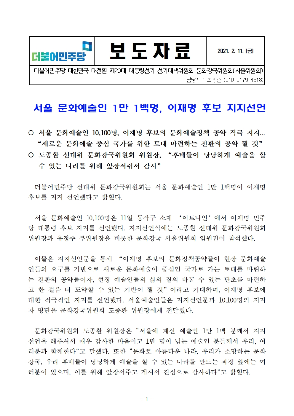 [보도자료] 더불어민주당 선대위 문화강국위원회, 서울 문화예술인 1만 1백명 후보 지지 선언